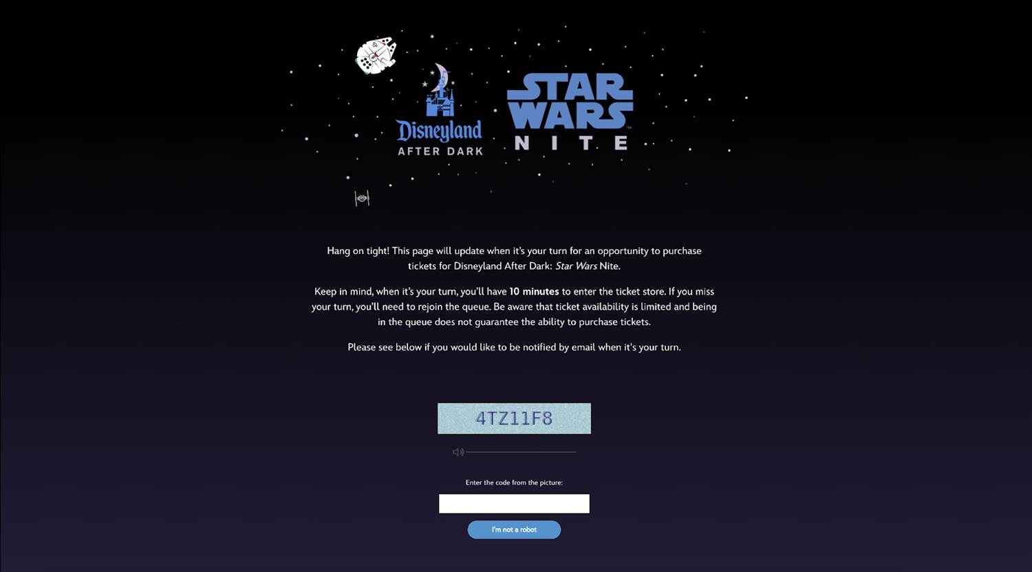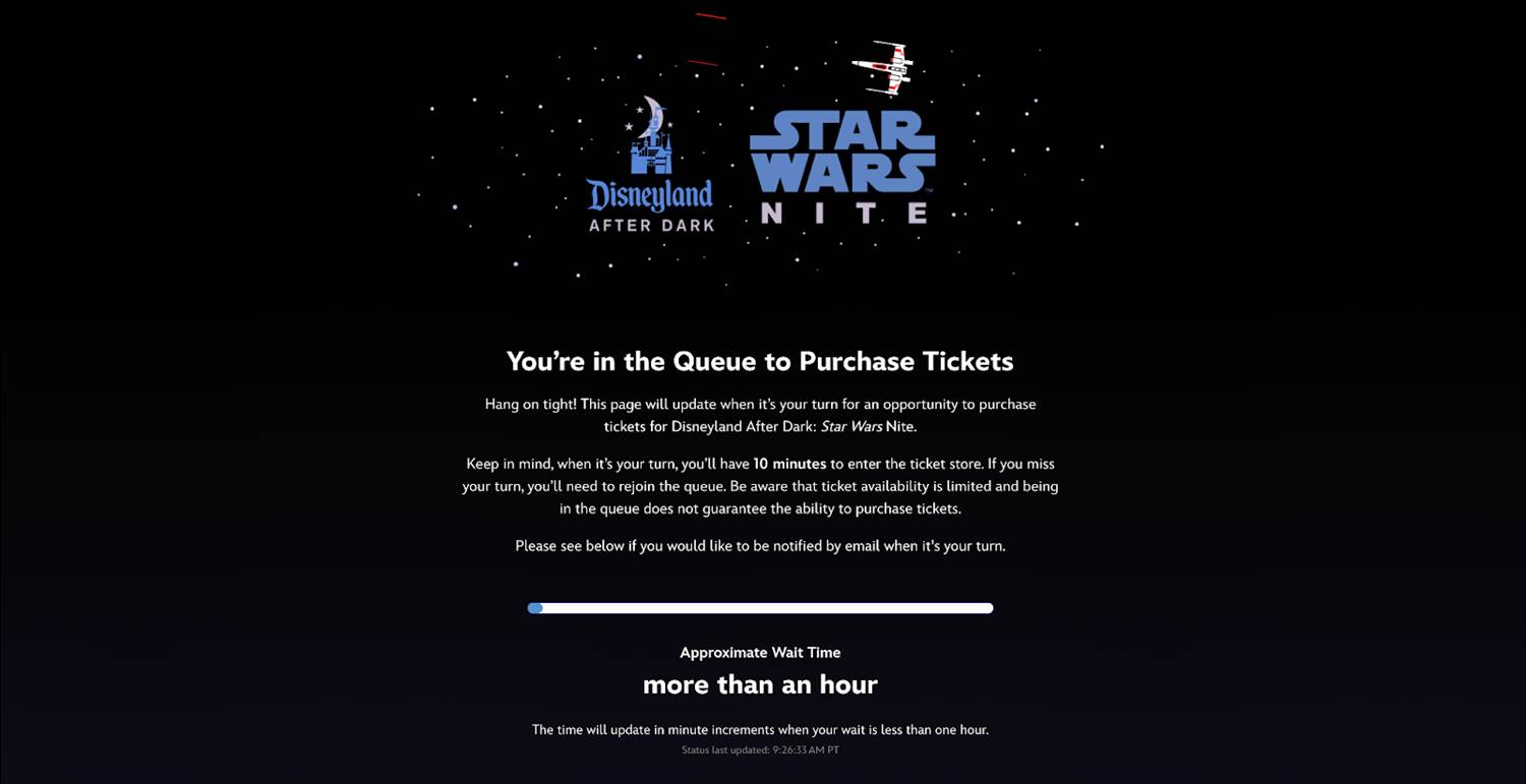 With tickets going on sale for this year’s Disneyland After Dark: Star Wars Nite events, a new “notify me" feature has been added allowing those waiting in the online queue to purchase tickets the ability to be notified when it's their turn to enter the ticket store.