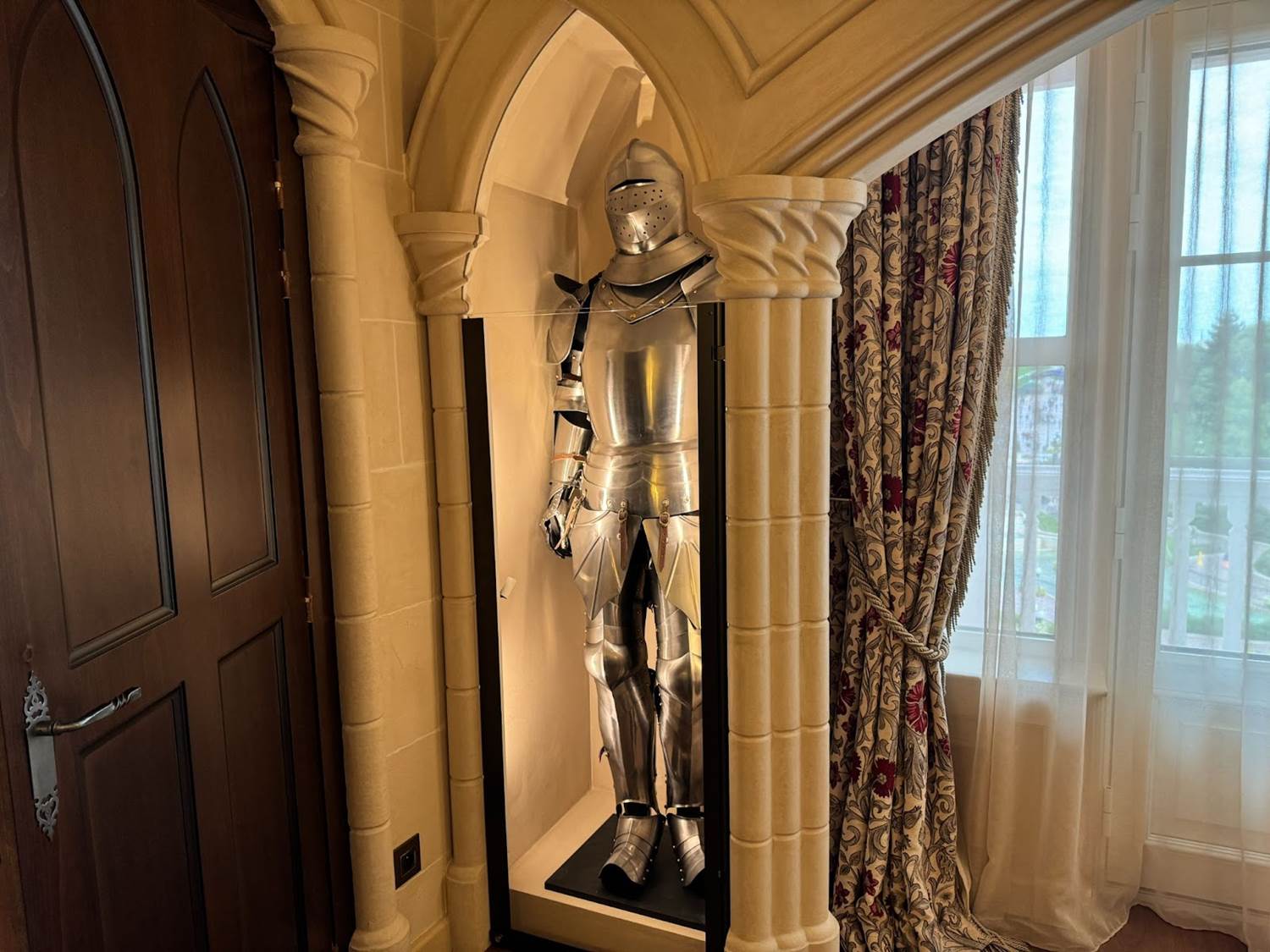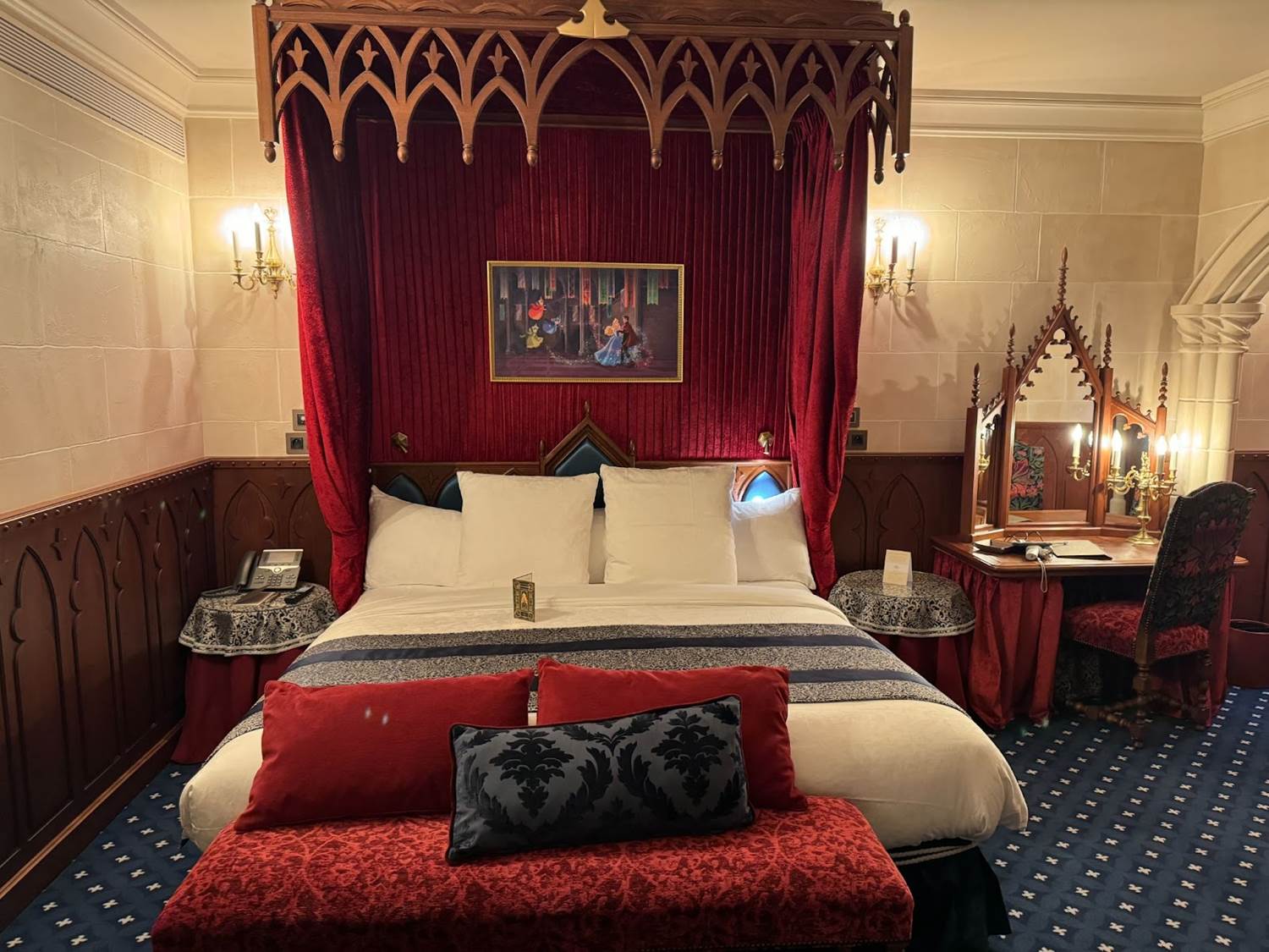 The Sleeping Beauty signature suite leans heavily into a medieval castle theme with rich jewel tones, deep wood accents, stonework columns, and arches. Along with beautiful artwork from Sleeping Beauty, you’ll find Aurora’s crown decorating the canopy over the bed, nods to the spinning wheel and even a full knight’s armor.