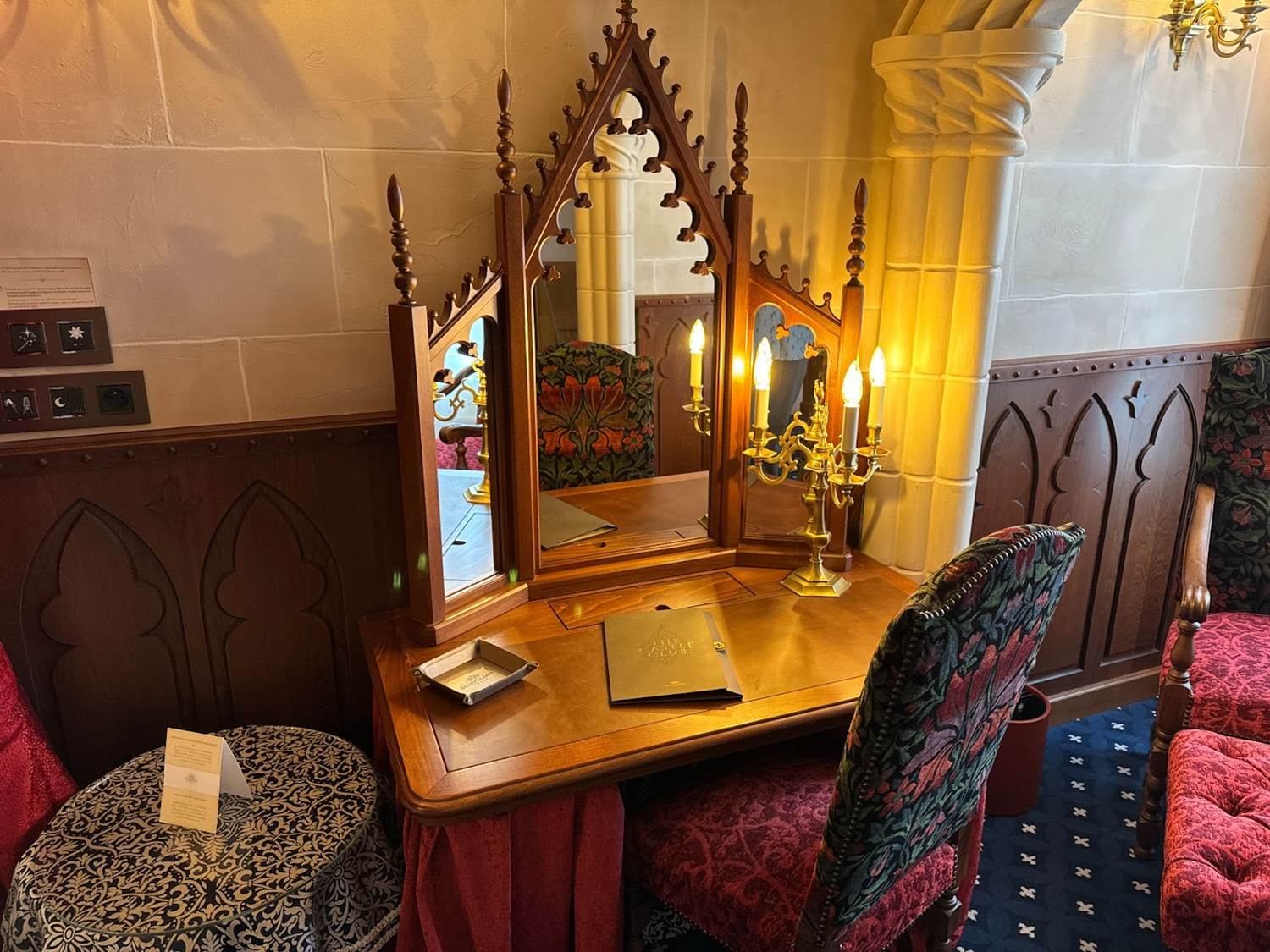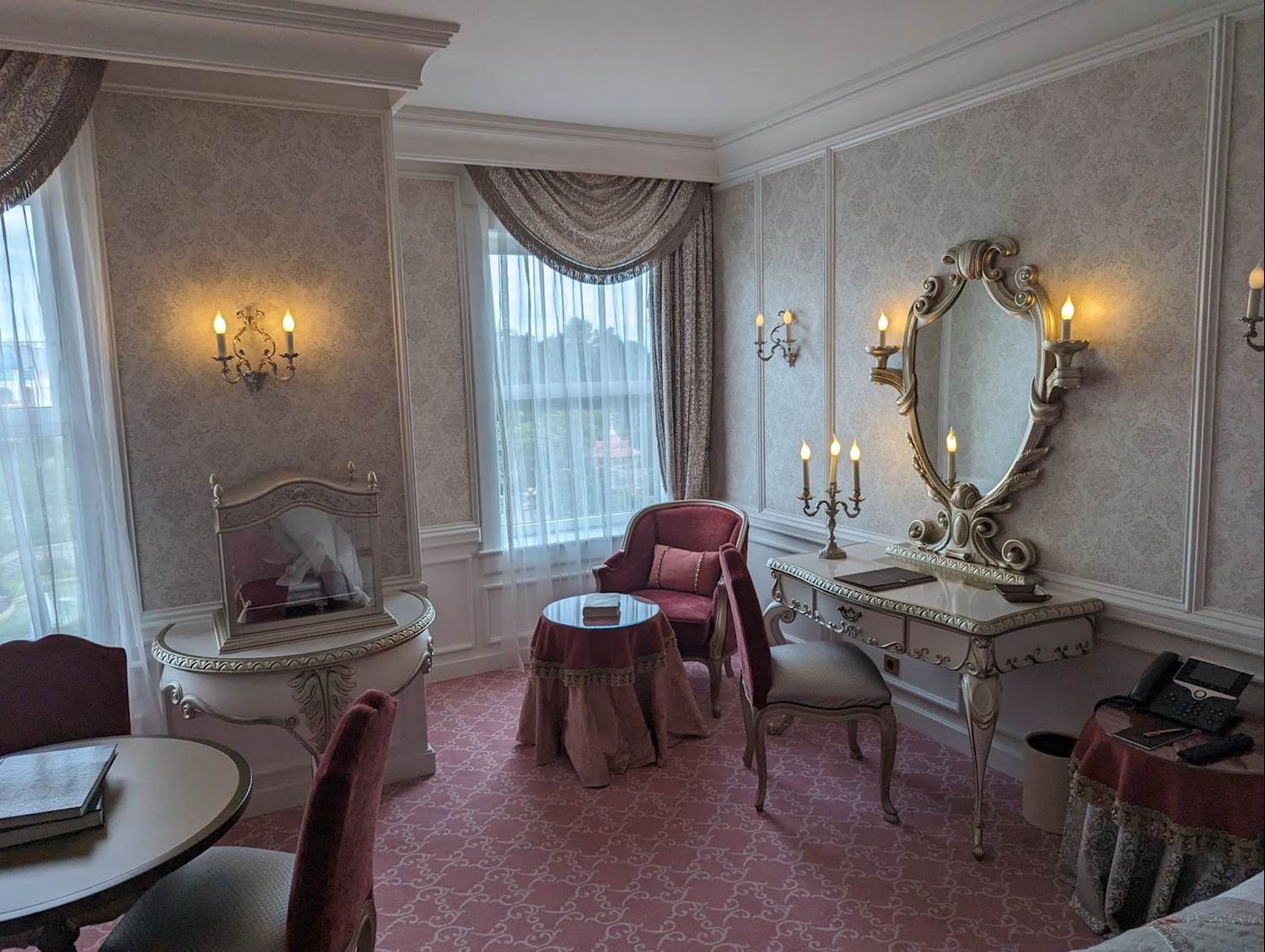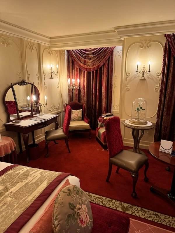 Each room has its own distinct designs — not only in fabrics and color palettes but even overall architectural designs and furnishings while offering the same overall amenities. Our suites all included a main bedroom with dressing table and lounging area, a sitting room where the sofa can become a bed and multi-room bathroom complete with bidet along with standard toilet. Hidden within the large mirror over the artificial fireplace is a television and its welcome screen features artwork from the suite’s storybook inspiration. And each has a magical component from within the story - Sleeping Beauty’s color changing gown, Cinderella’s slipper, Beast’s enchanted rose and Tangled’s Sundrop flower.