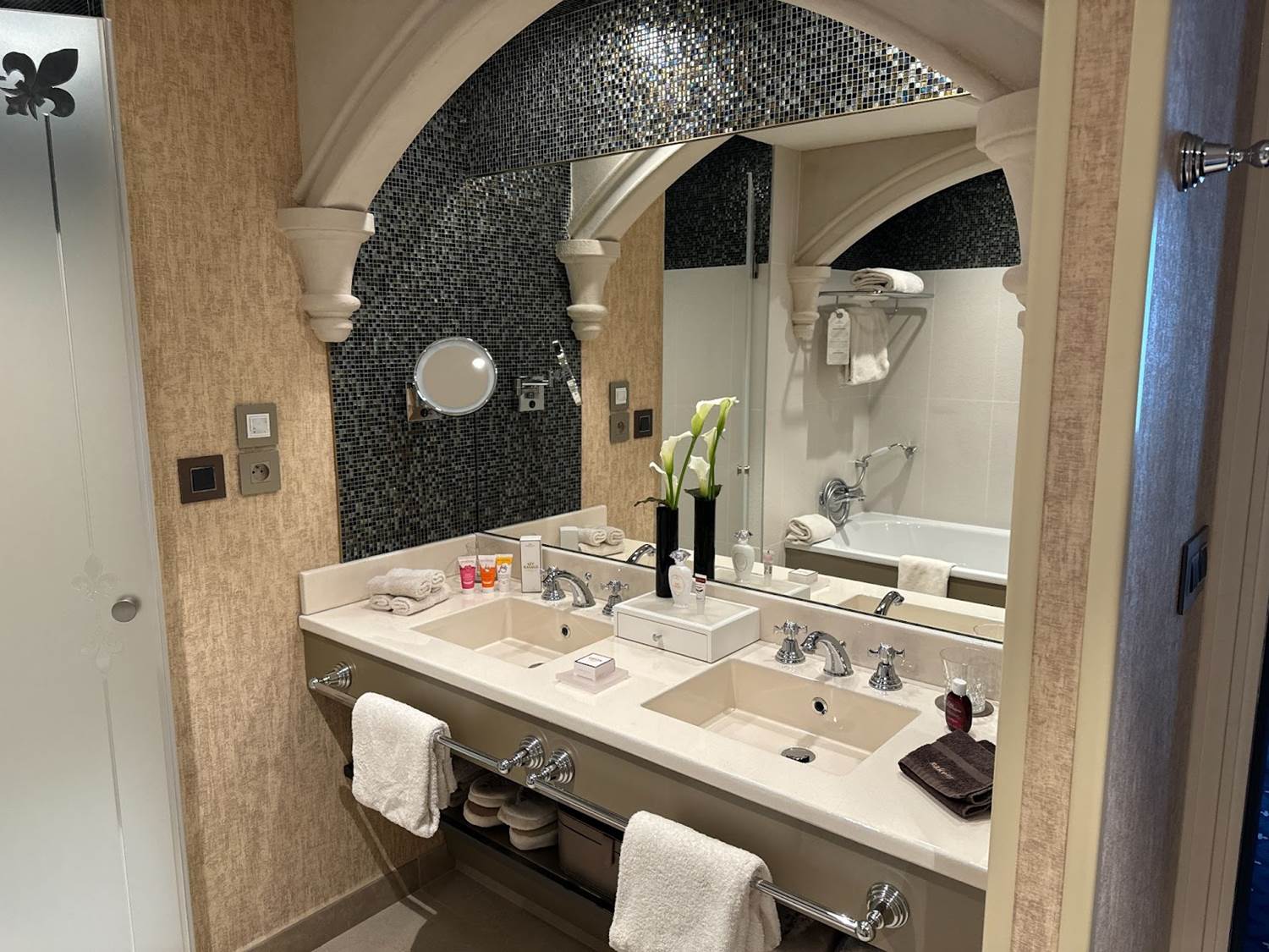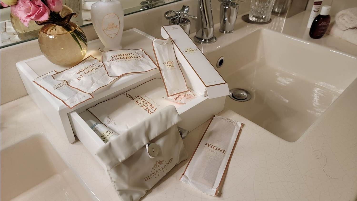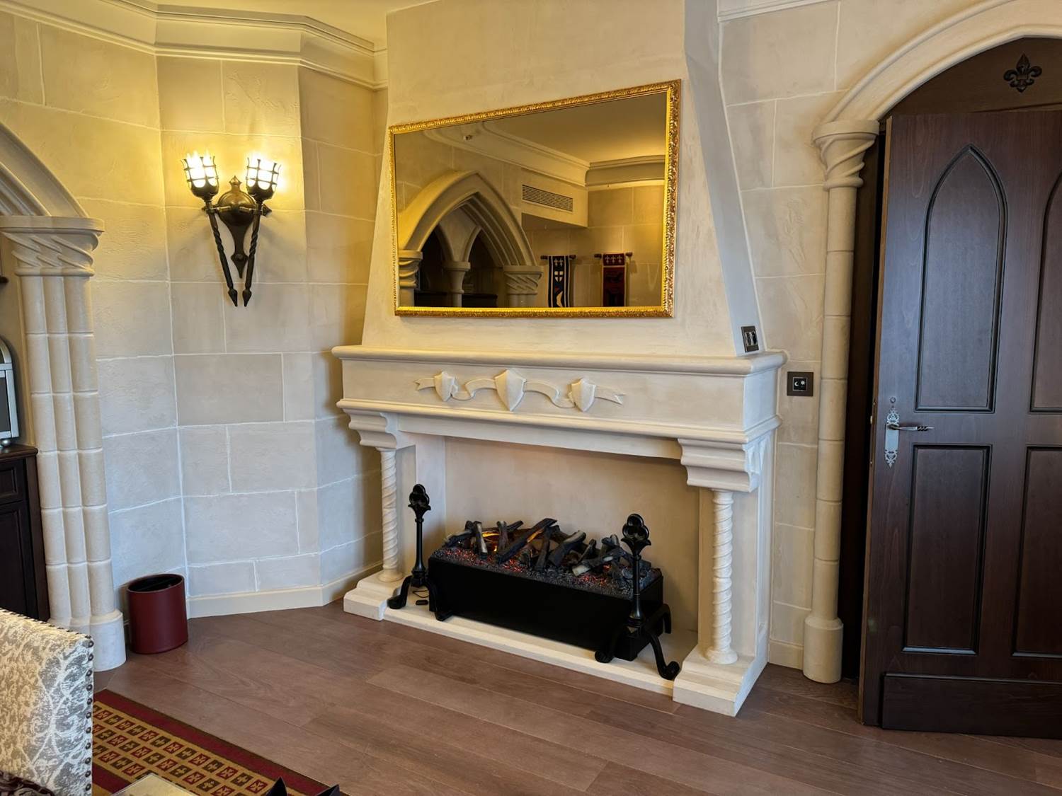 Each room has its own distinct designs — not only in fabrics and color palettes but even overall architectural designs and furnishings while offering the same overall amenities. Our suites all included a main bedroom with dressing table and lounging area, a sitting room where the sofa can become a bed and multi-room bathroom complete with bidet along with standard toilet. Hidden within the large mirror over the artificial fireplace is a television and its welcome screen features artwork from the suite’s storybook inspiration. And each has a magical component from within the story - Sleeping Beauty’s color changing gown, Cinderella’s slipper, Beast’s enchanted rose and Tangled’s Sundrop flower.