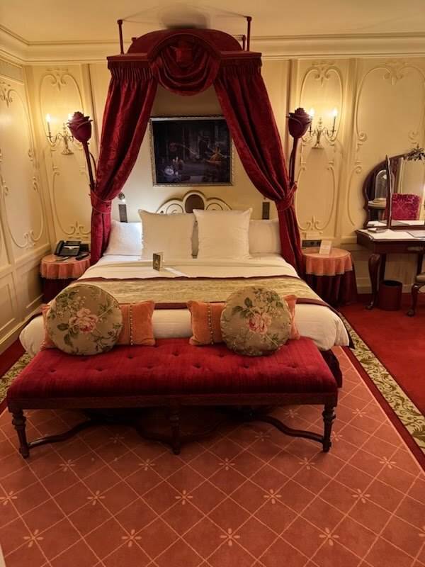 The Beauty and the Beast signature suite is awash in romantic deep red rose tones that evoke the Beast’s cape. Candelabras bring Lumiere to mind while the swirled wall designs evoke the Baroque flourishes of Cogsworth and eagle eyes may spot a familiar step stool.