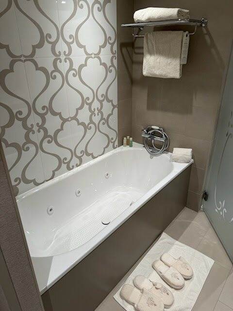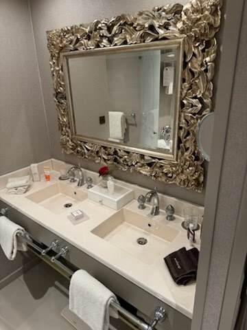 While each signature bathroom had a deep tub, a shower and double sink vanity the design choices of each differed to fit the suit’s theme.