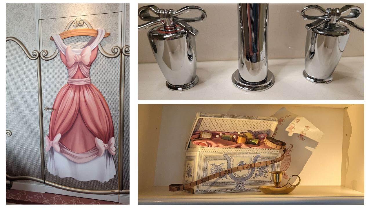 Among the nods to the film are the dress Cinderella’s mice & bird friends sewed for her, which hangs on the door to the washroom. In addition, a sewing kit and sketches for the dress can be found in the sitting room and delightful bows serve as the handles on the sink.