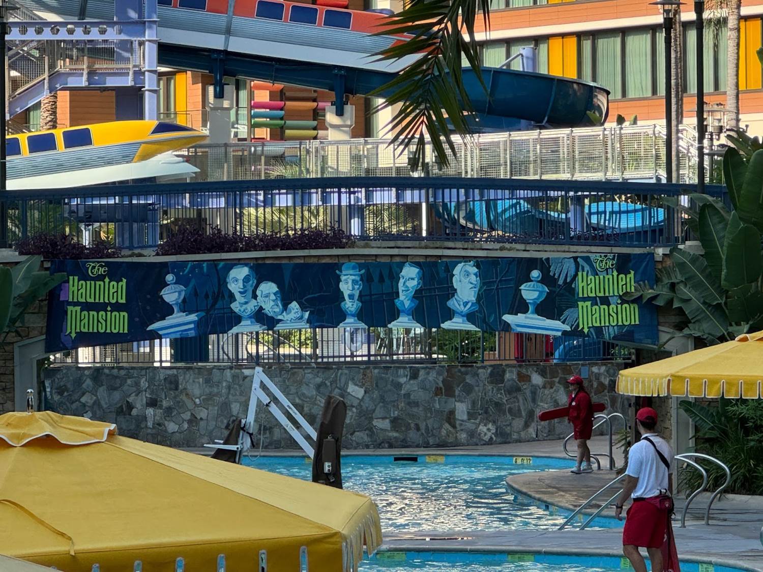 More Haunted Mansion fun can be found over at the E-Ticket Pool, with a banner featuring the Singing Busts over the bridge leading to Tangaroa Terrace.