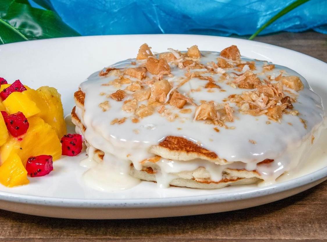 - Coconut-Macadamia Pancakes: Short stack pancakes, coconut cream, toasted macadamia nuts and tropical fruit available at River Belle Terrace