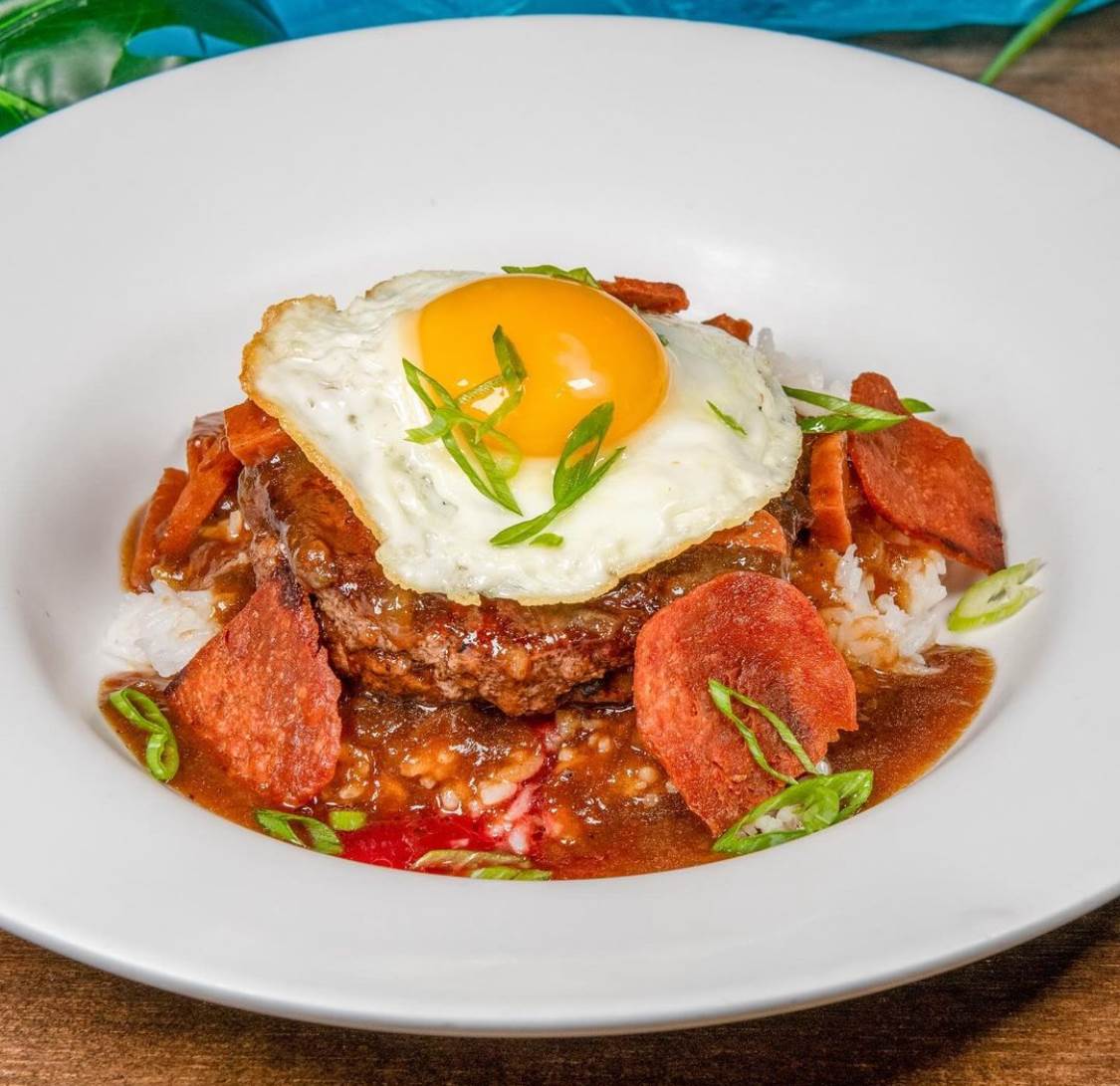 - Hamburger Steak & Eggs with spiced ham fried rice, eggs and mushroom gravy available at River Belle Terrace