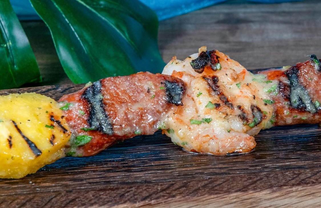 - Grilled Shrimp Skewer with sausage and pineapple, topped with coconut vinaigrette available at Bengal Barbecue