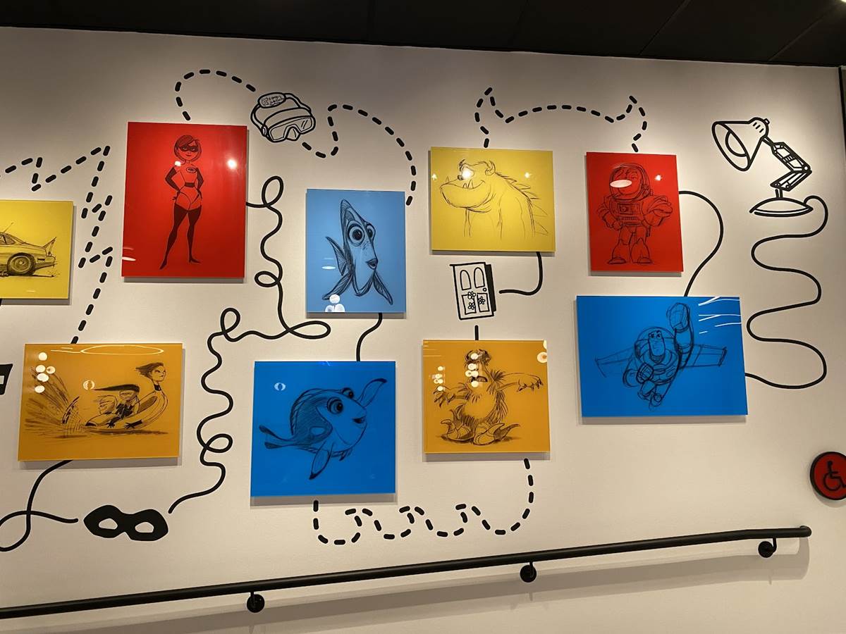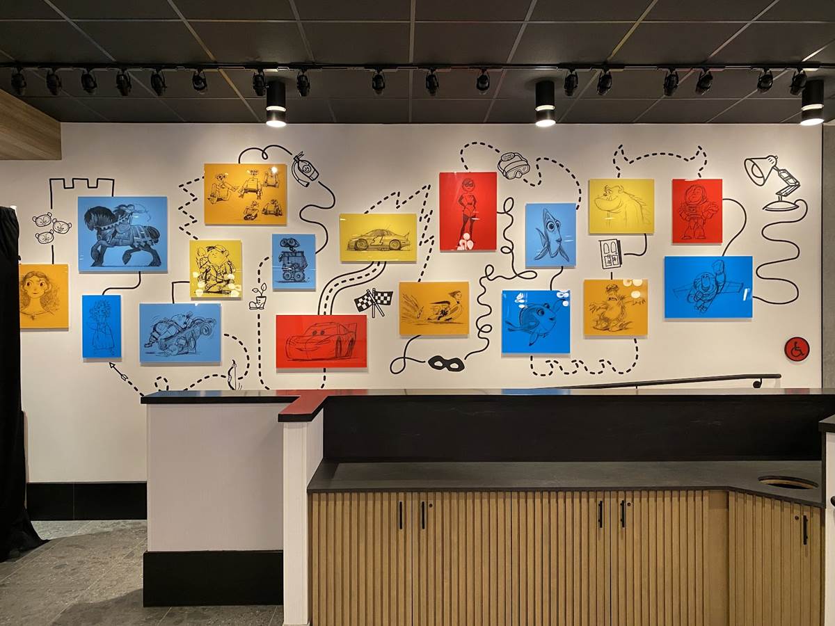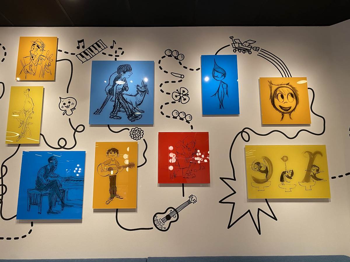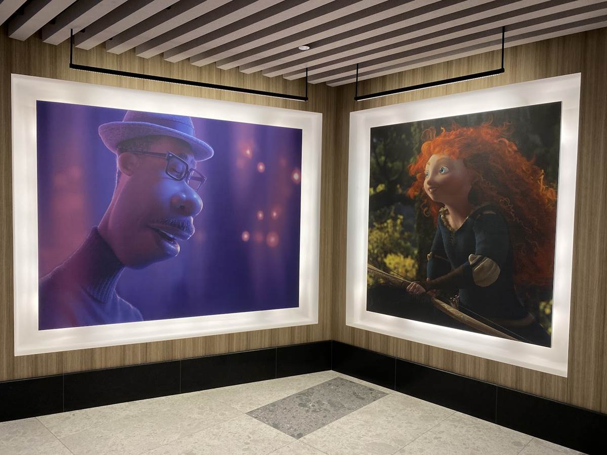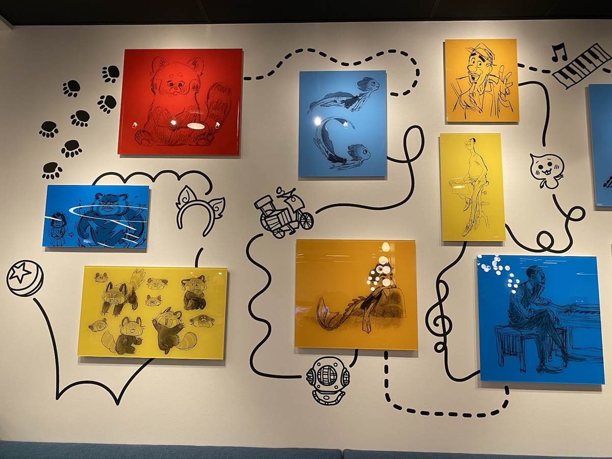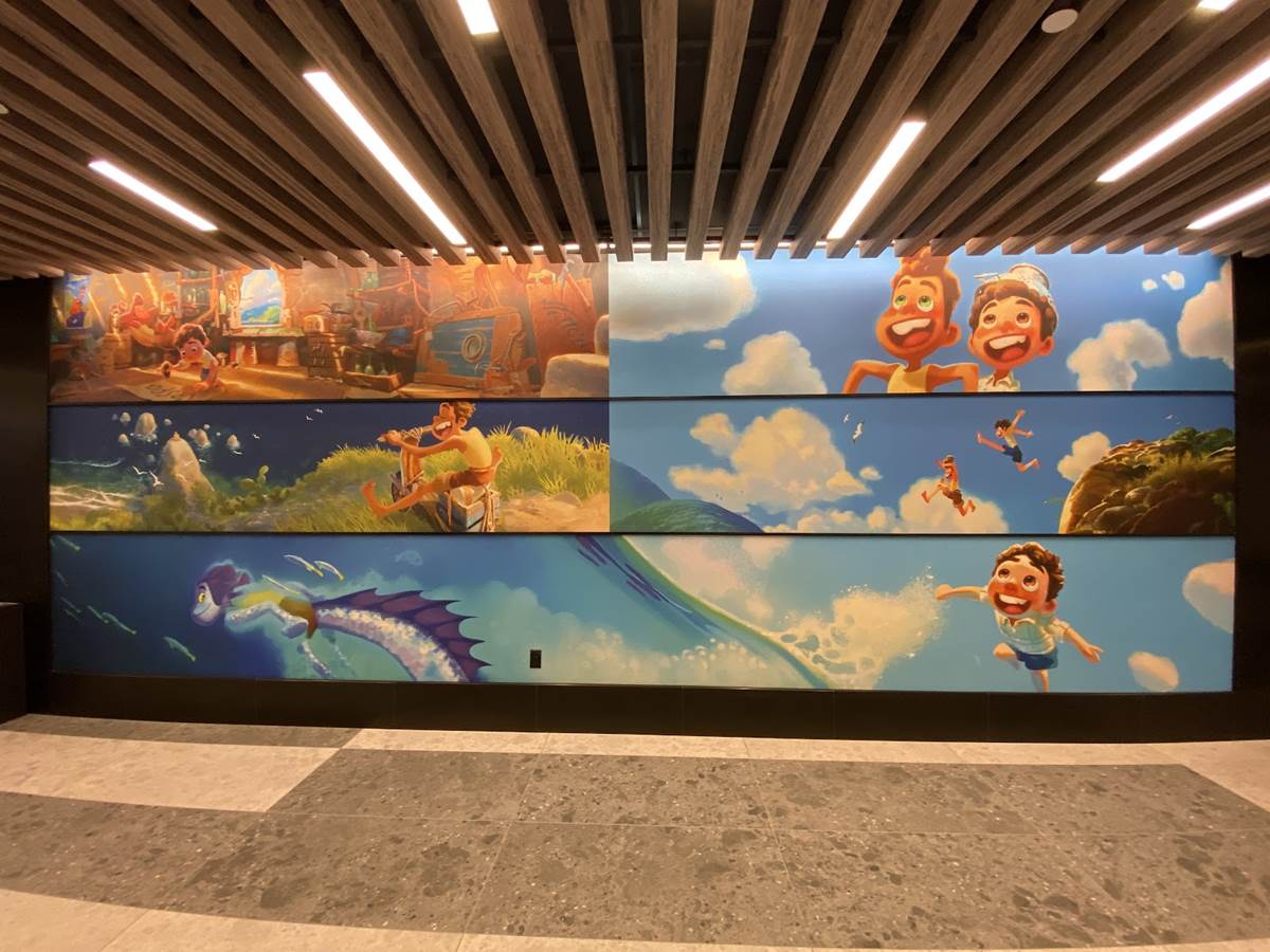 The lobby also features color scripts from various films, including Finding Nemo and Luca.