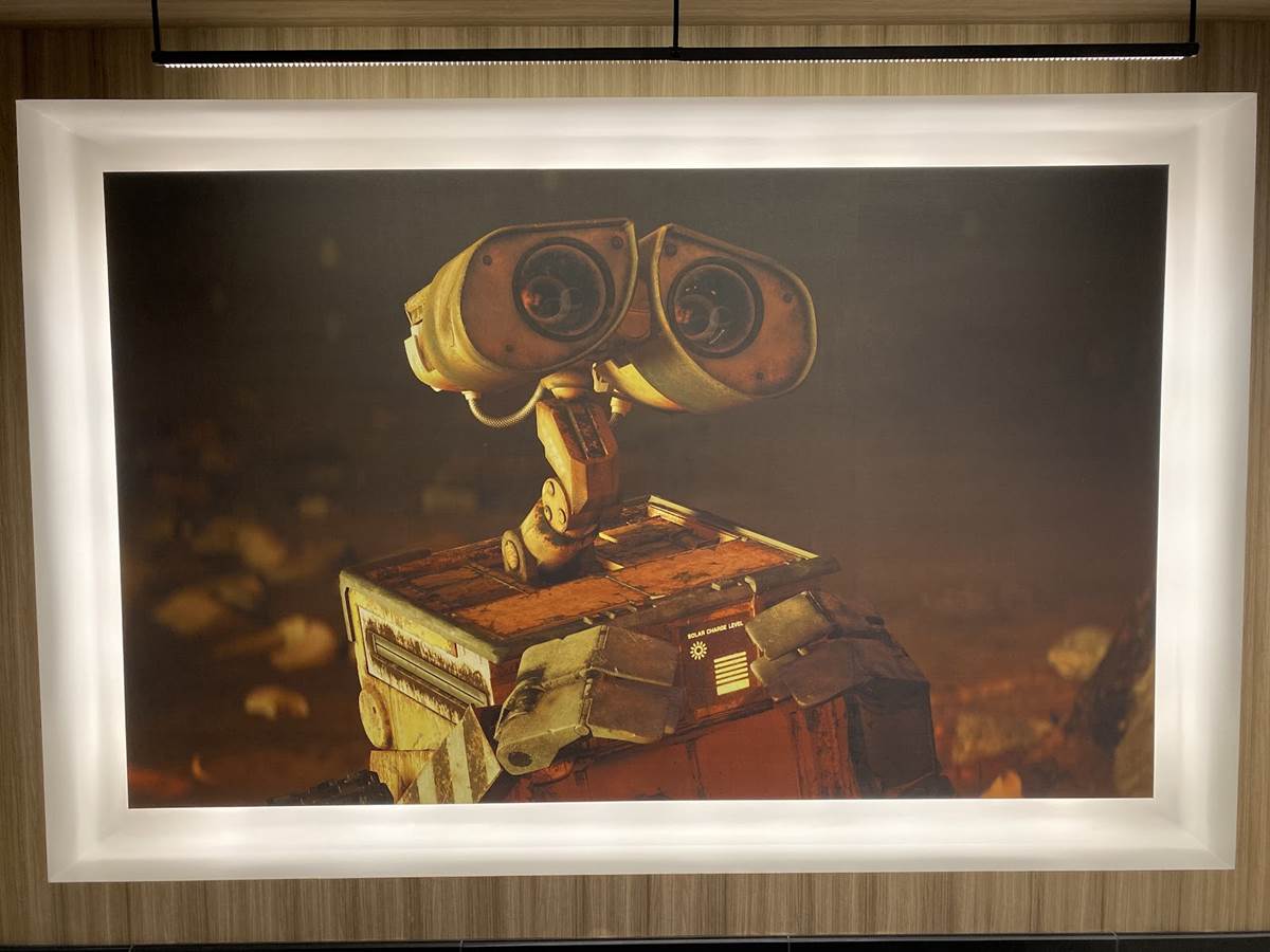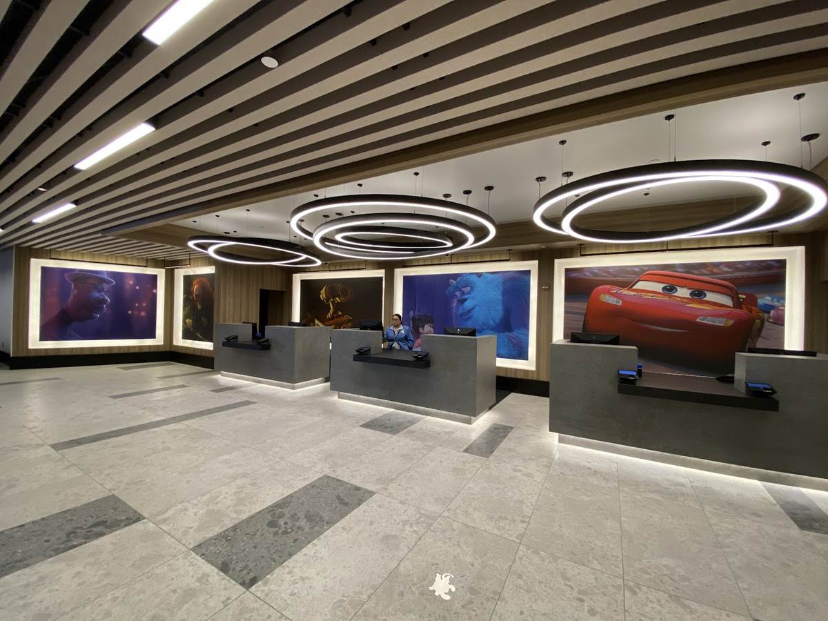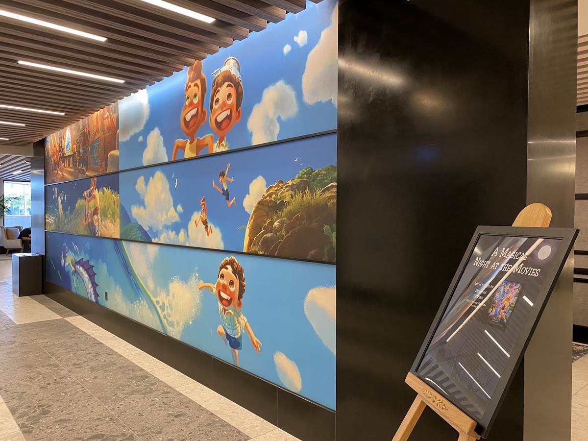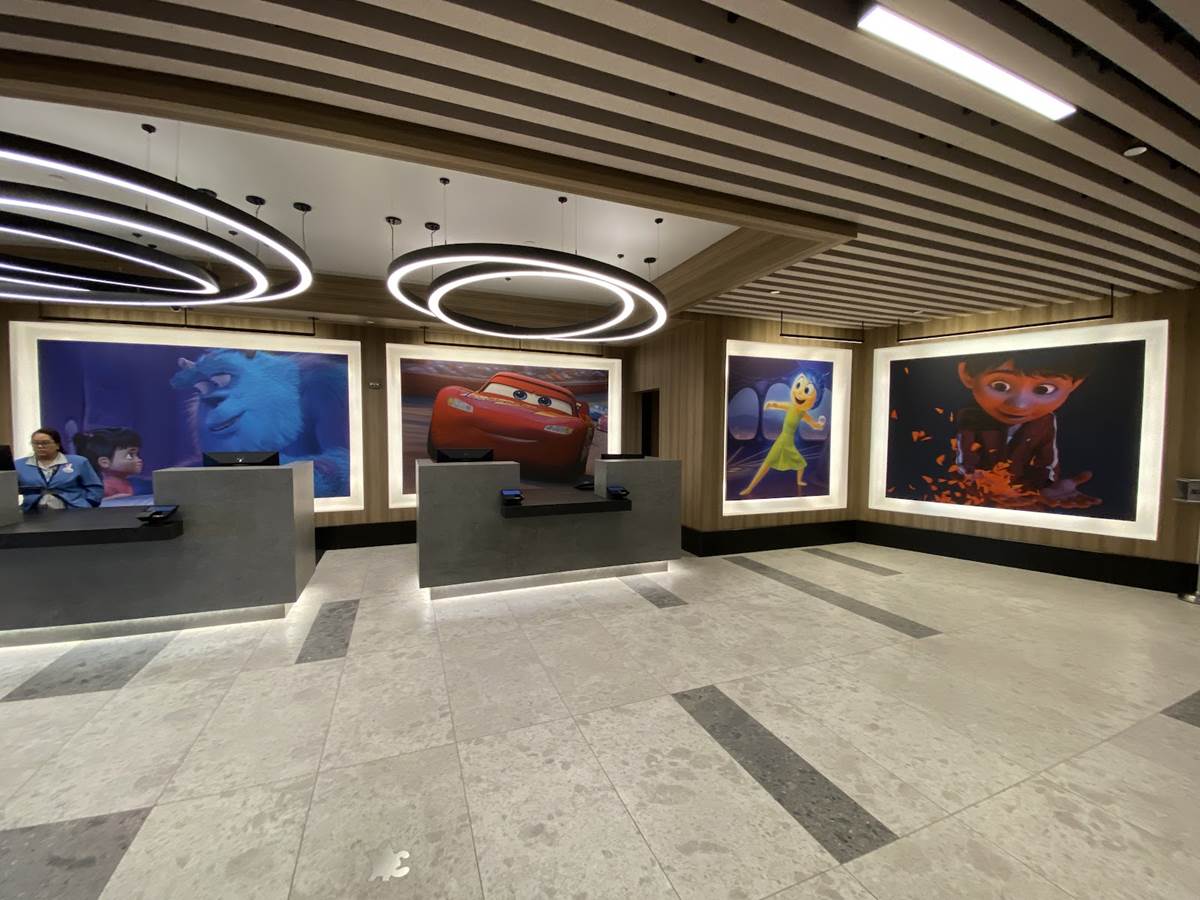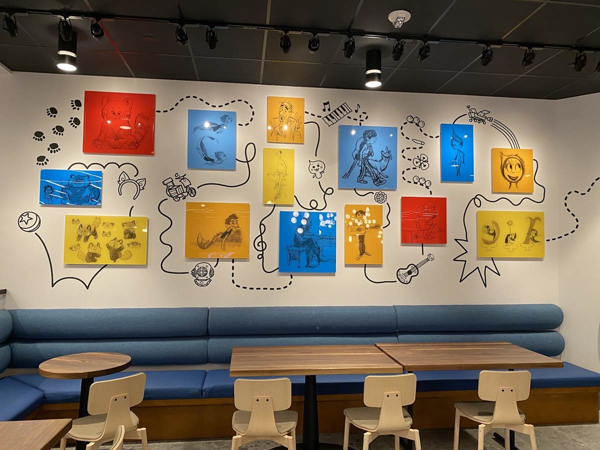 The lobby also features color scripts from various films, including Finding Nemo and Luca.