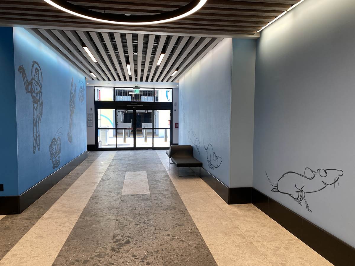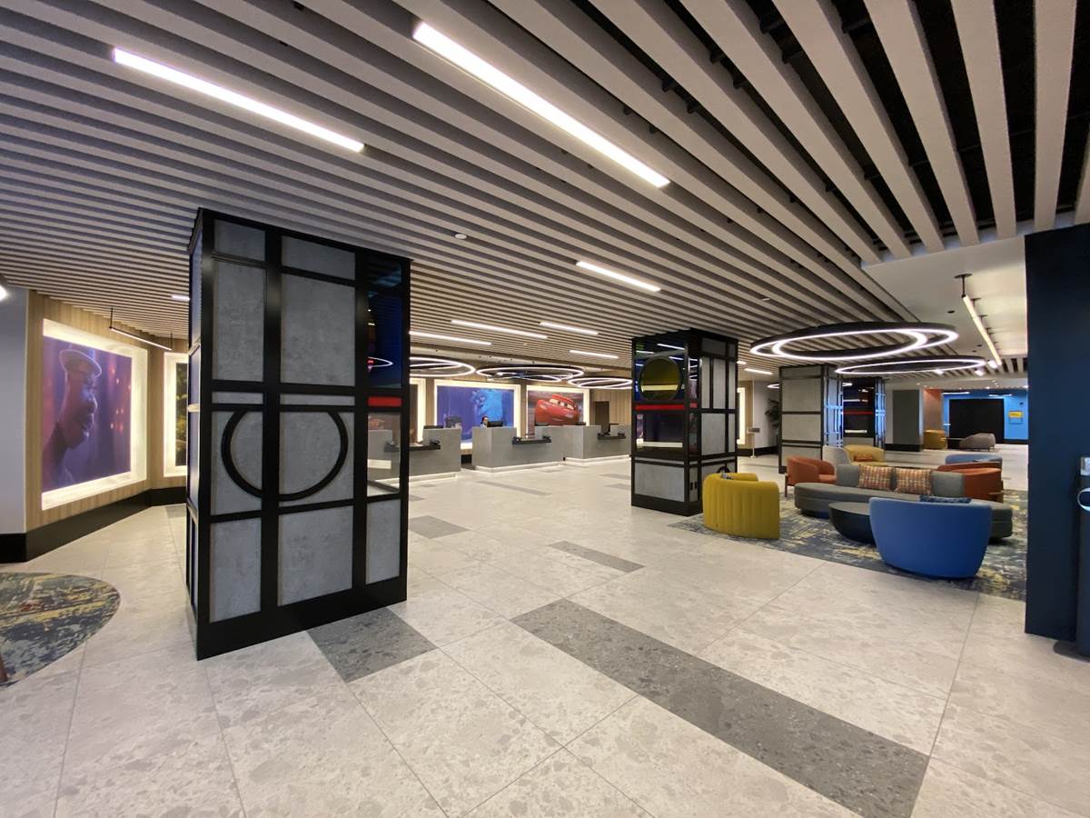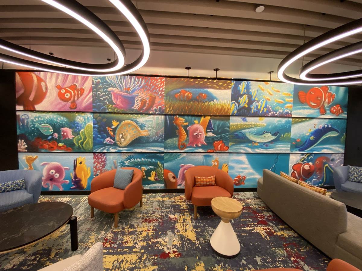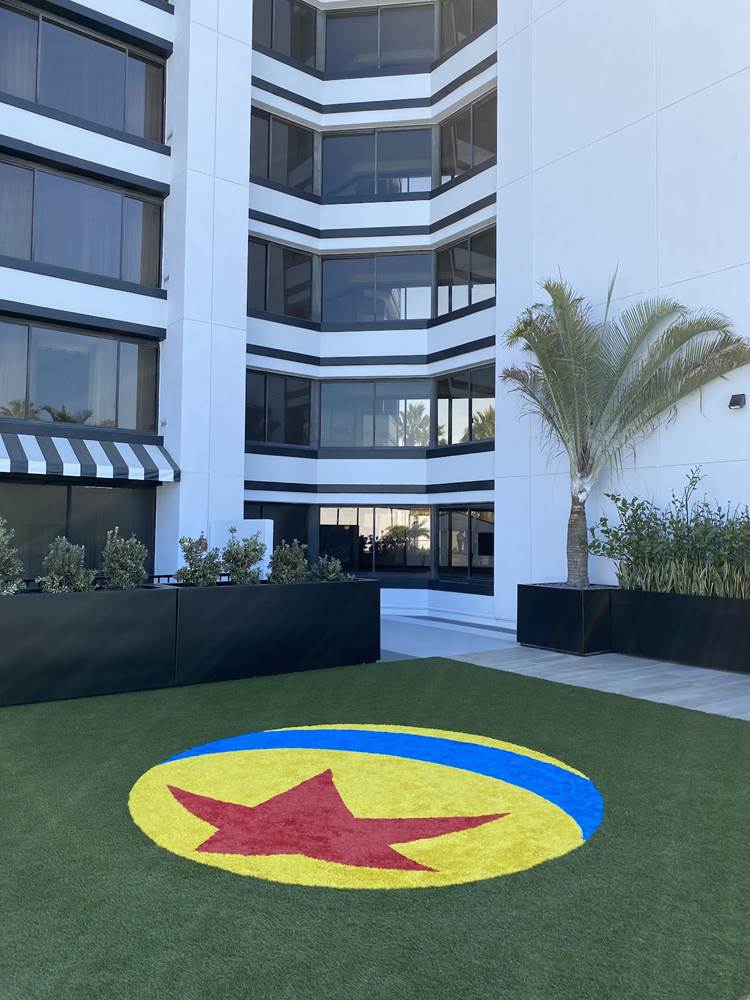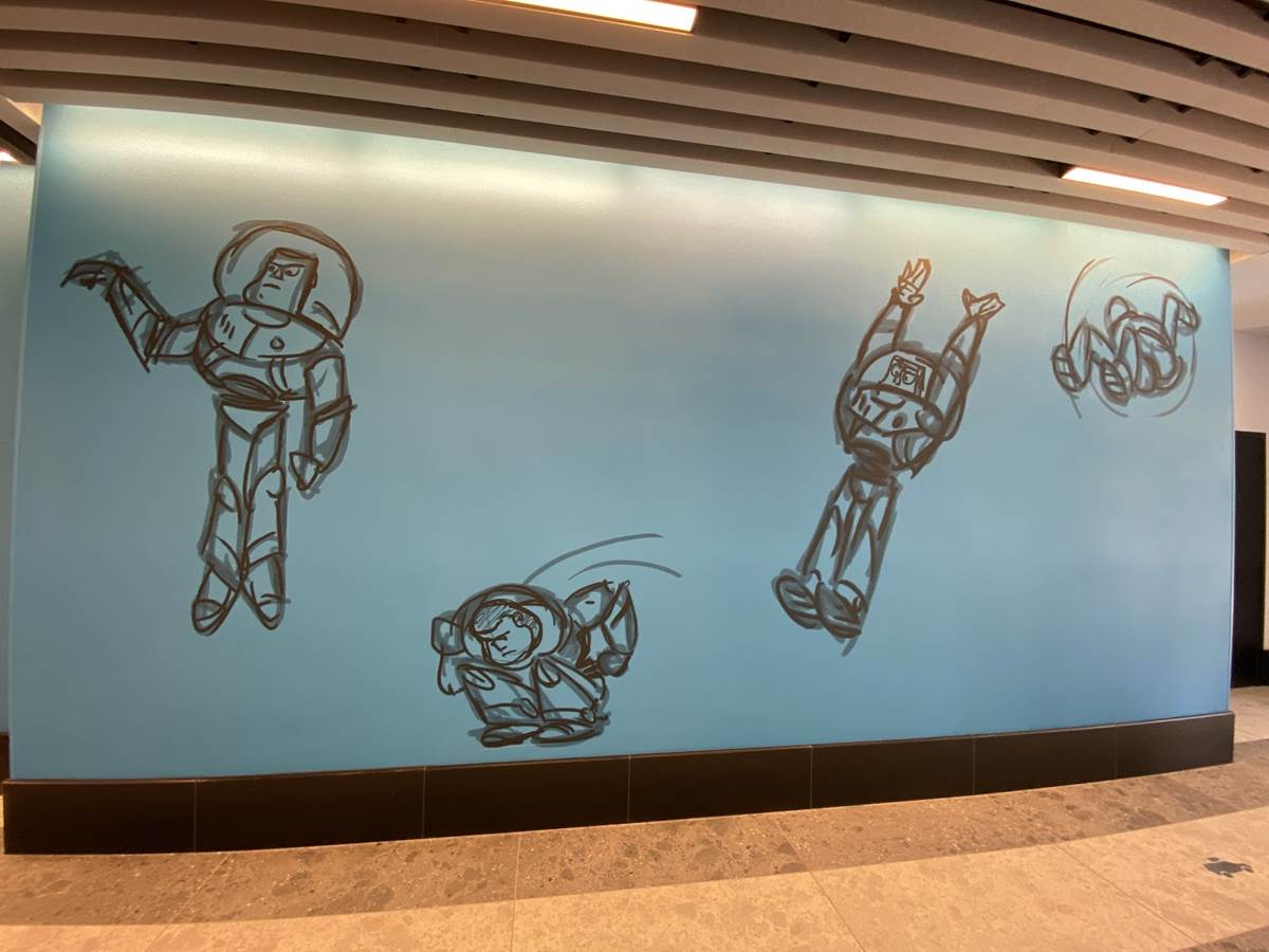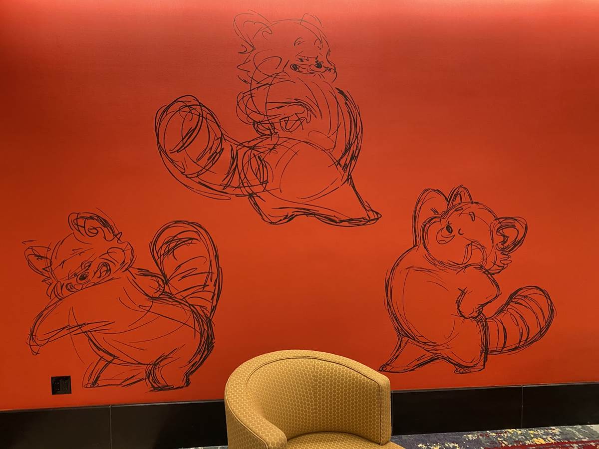 The lobby also features color scripts from various films, including Finding Nemo and Luca.