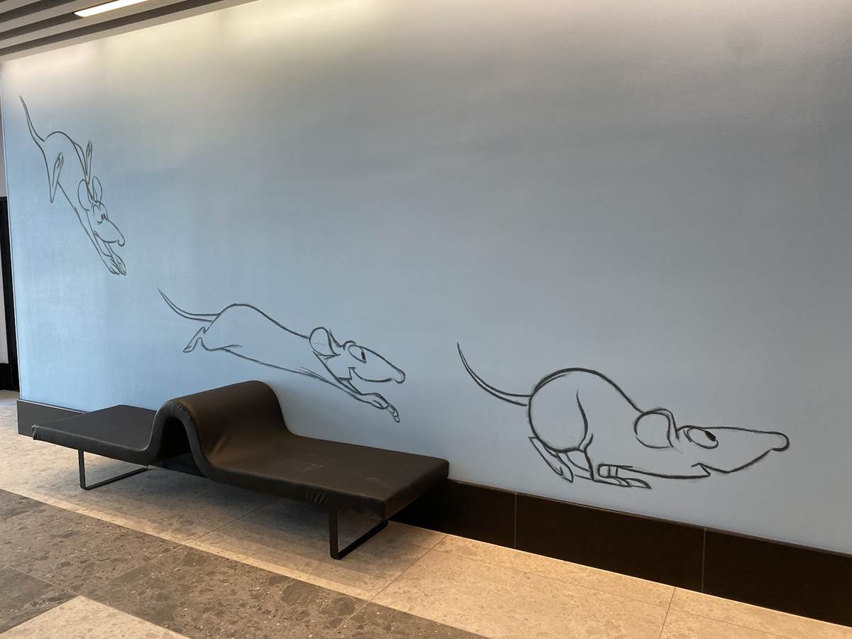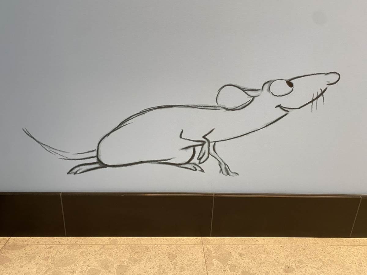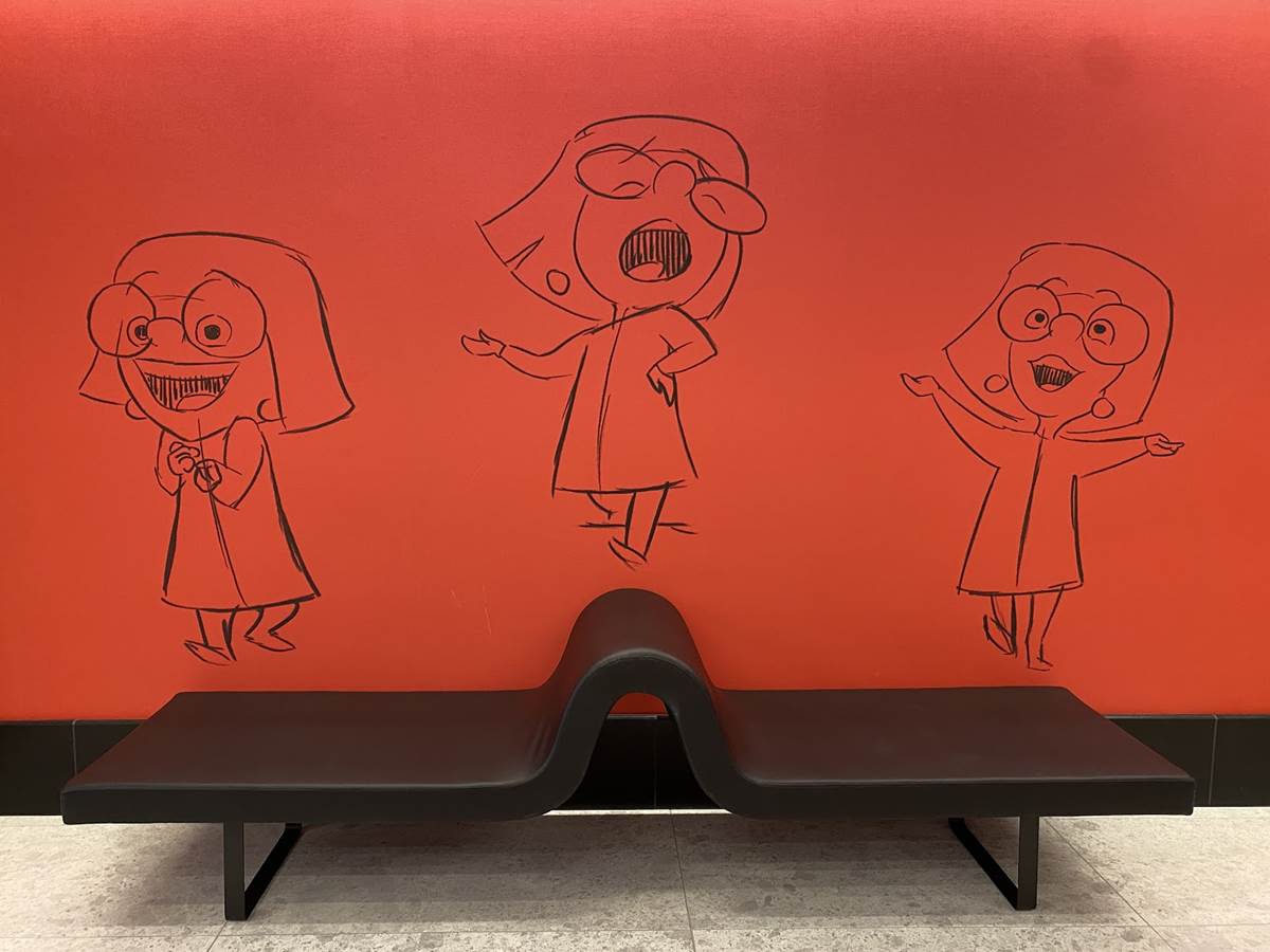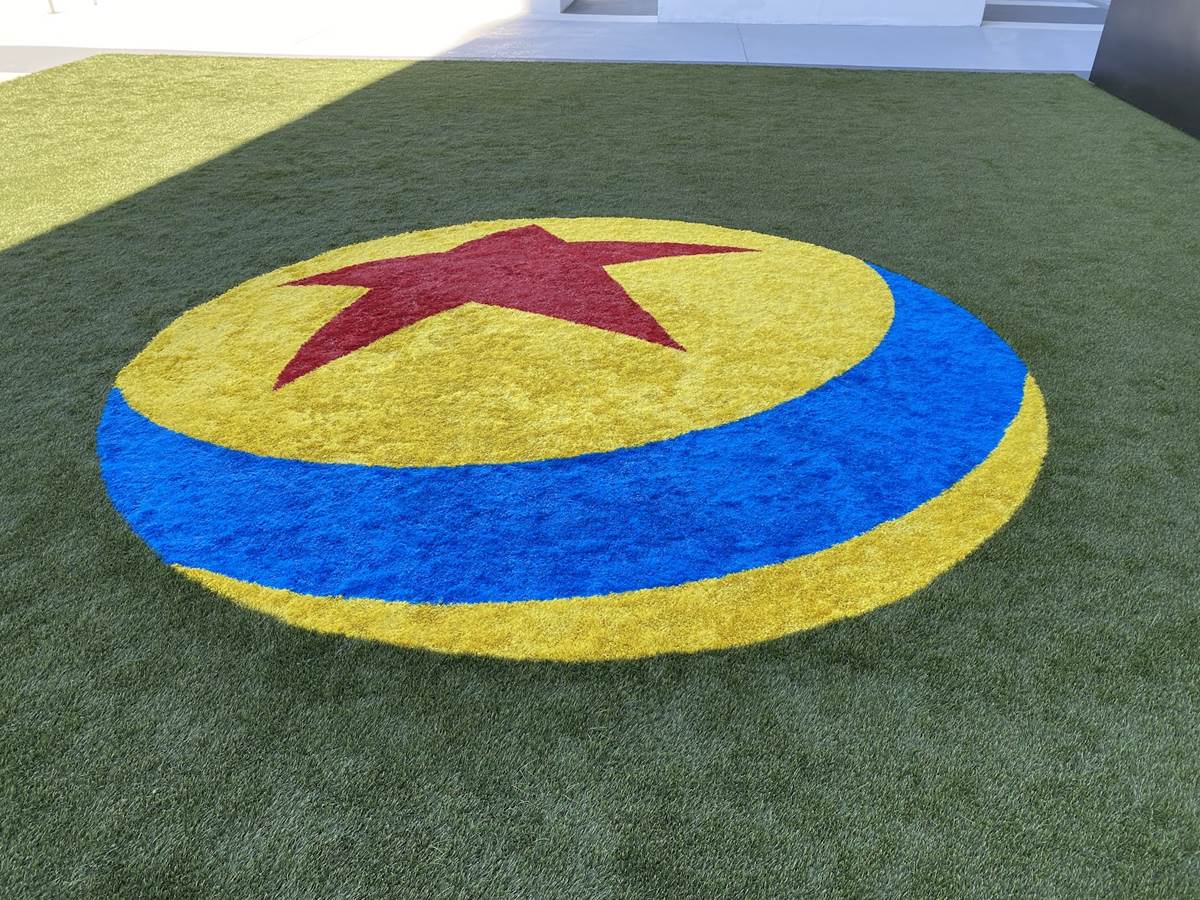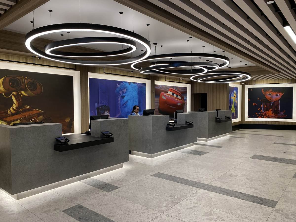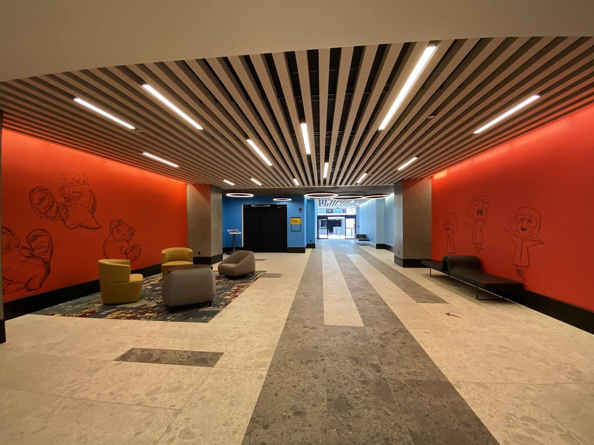 The lobby also features color scripts from various films, including Finding Nemo and Luca.