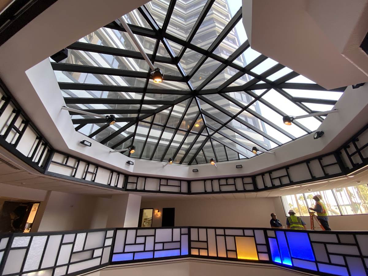 The atrium was once home to a statue featuring Goofy and a surfboard, marking the beachy theme of the Paradise Pier Hotel. As you can see in the pictures, that statue is long gone, and the whole atrium is expected to look like the art below when complete.