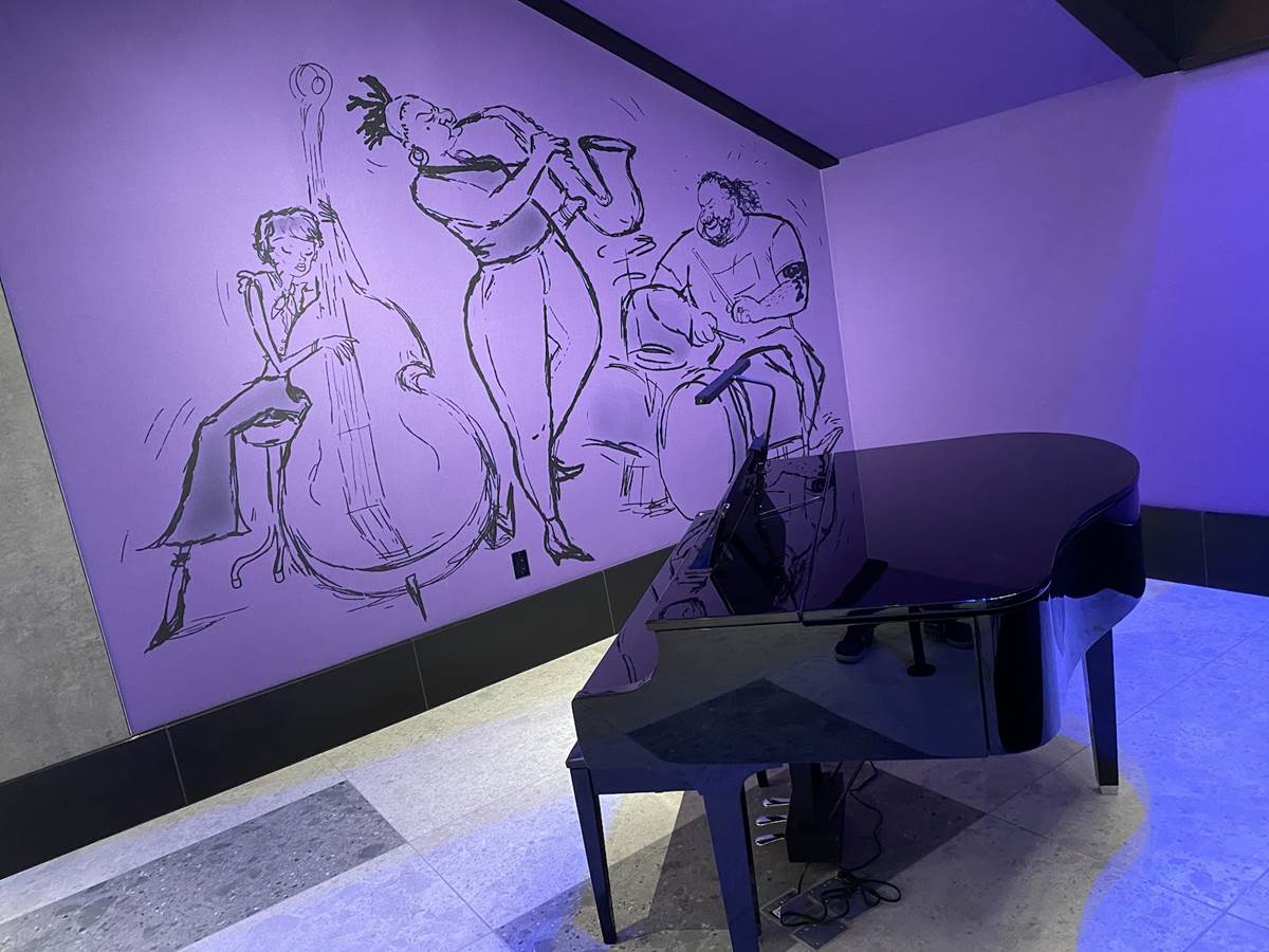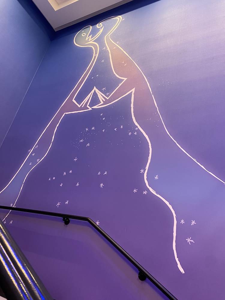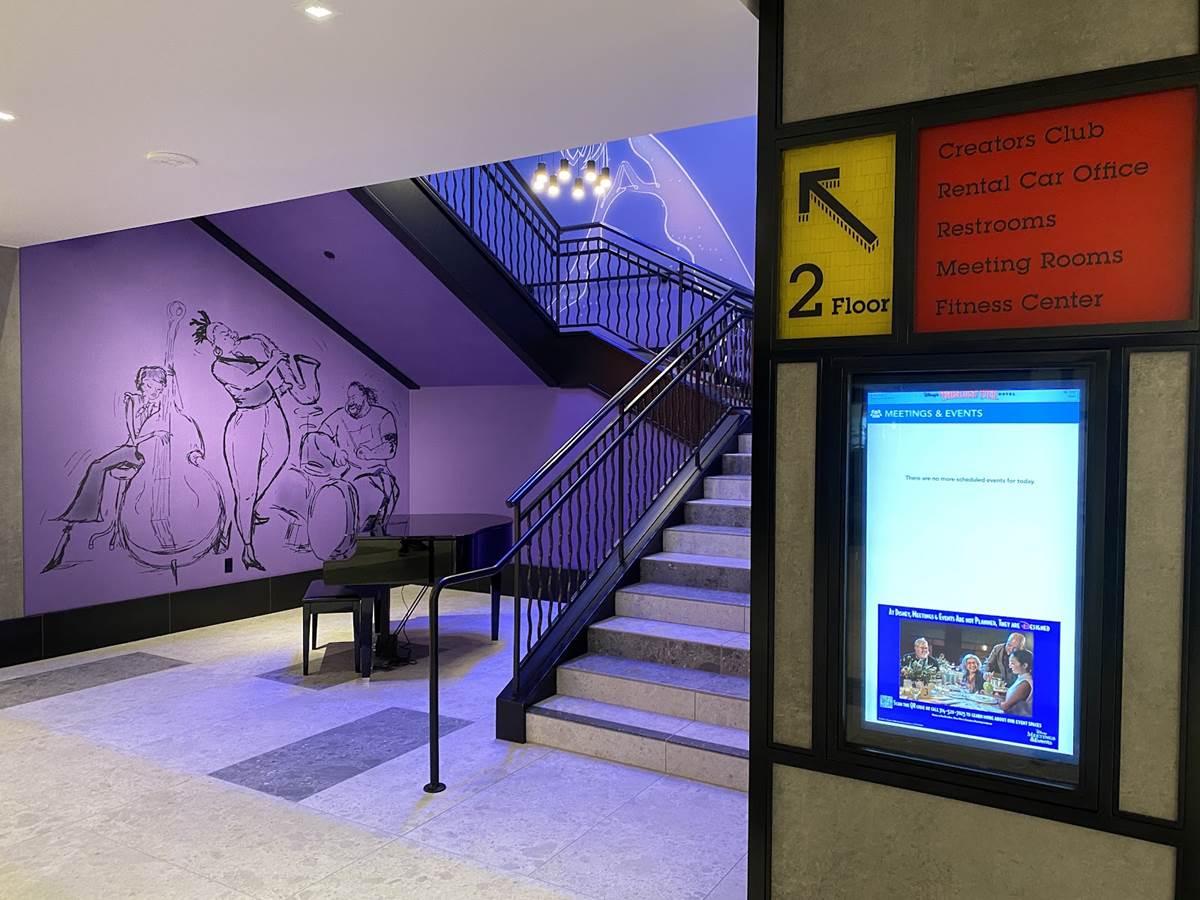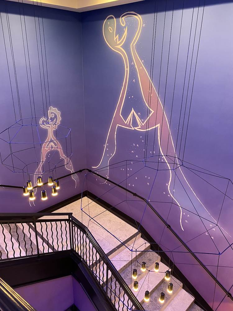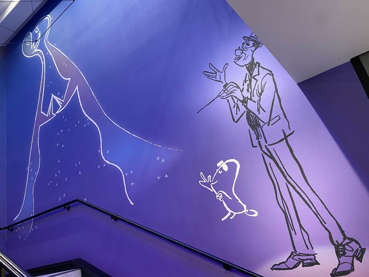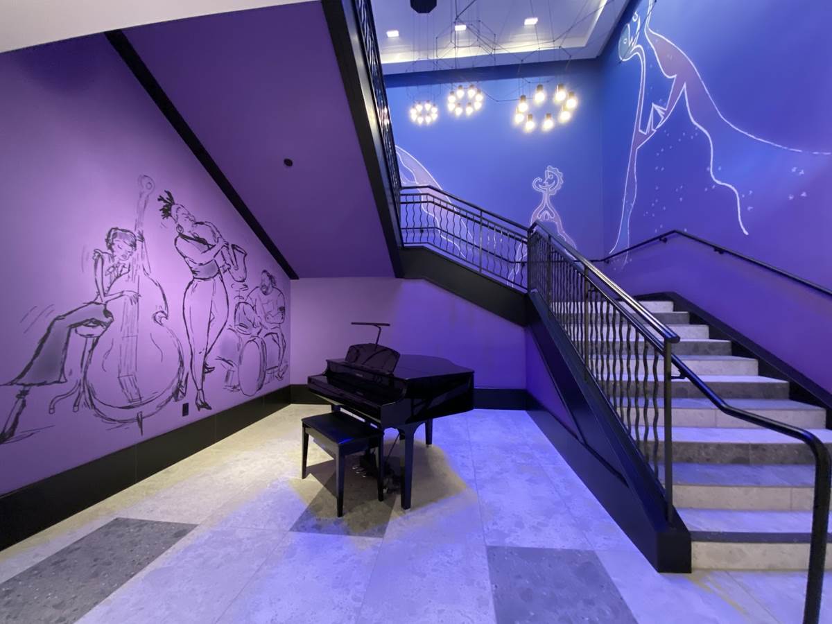 While there are plenty of character touches already found in the areas that guests can access, a standout for us is a staircase themed to one of the newer films in the Pixar catalog, Soul. The staircase is a deep purple, wrapping around a piano and surrounded by art featuring the counselors (AKA The Jerrys) from the film., as well as Joe Gardner and Dorothea’s jazz band.