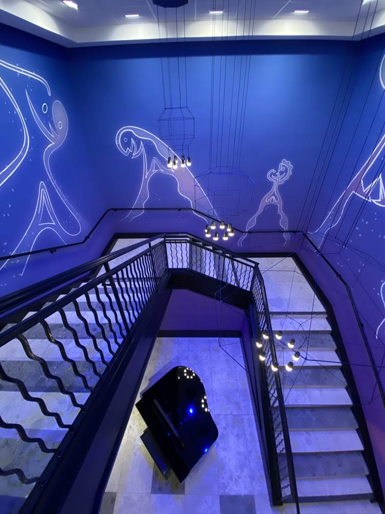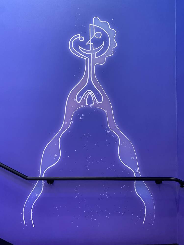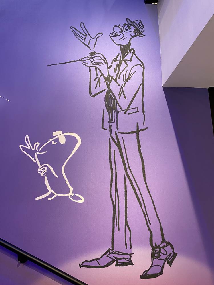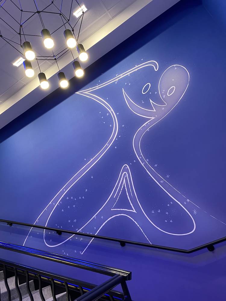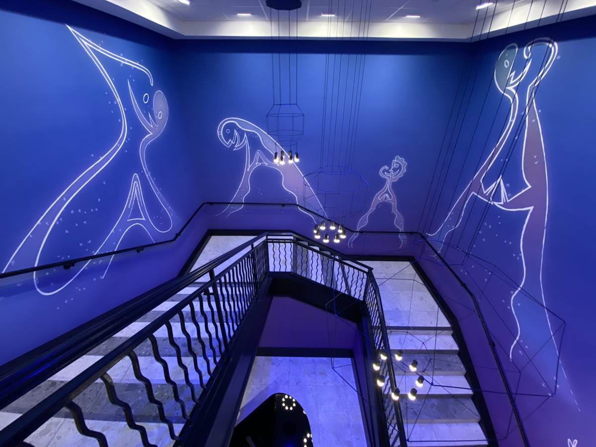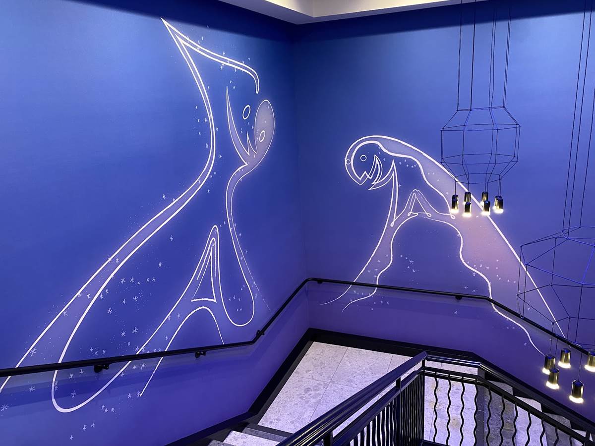 While there are plenty of character touches already found in the areas that guests can access, a standout for us is a staircase themed to one of the newer films in the Pixar catalog, Soul. The staircase is a deep purple, wrapping around a piano and surrounded by art featuring the counselors (AKA The Jerrys) from the film., as well as Joe Gardner and Dorothea’s jazz band.