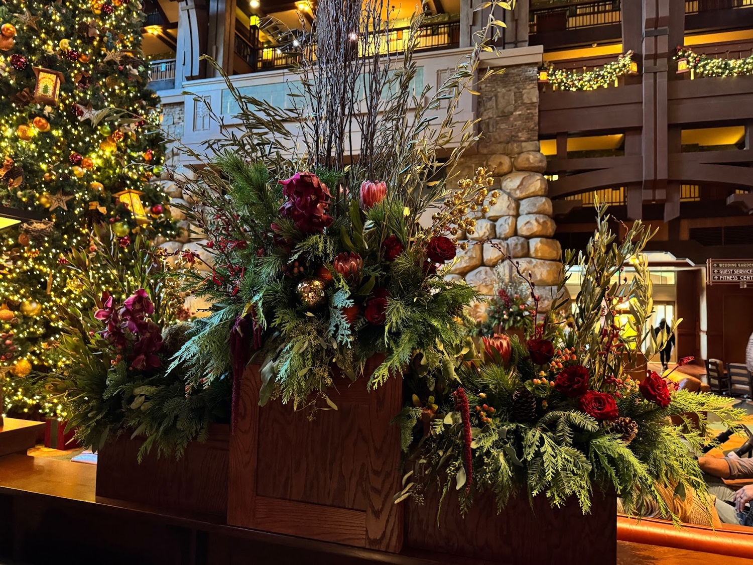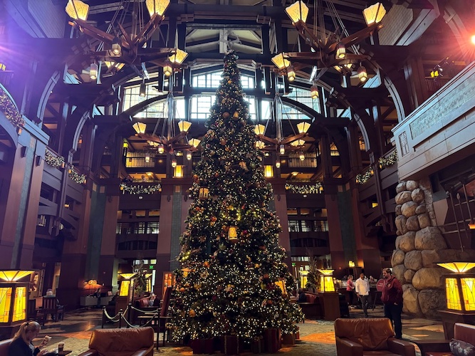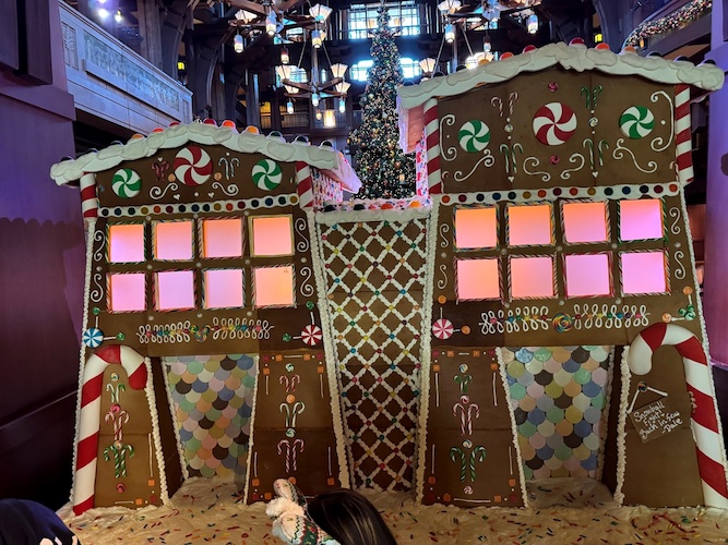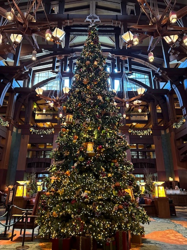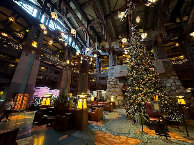 The majestic lobby of Disney’s Grand Californian Hotel & Spa is all decked out for the holidays, complete with an impressively large Christmas tree, gingerbread house and special treats.