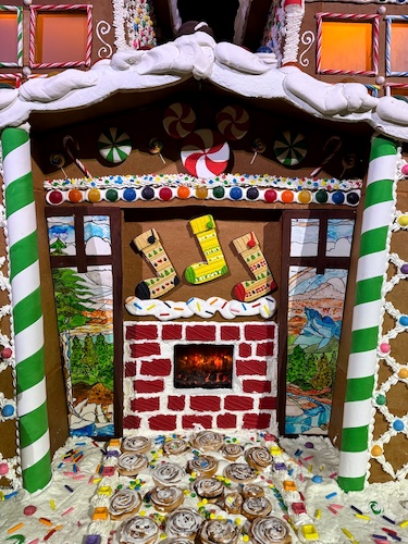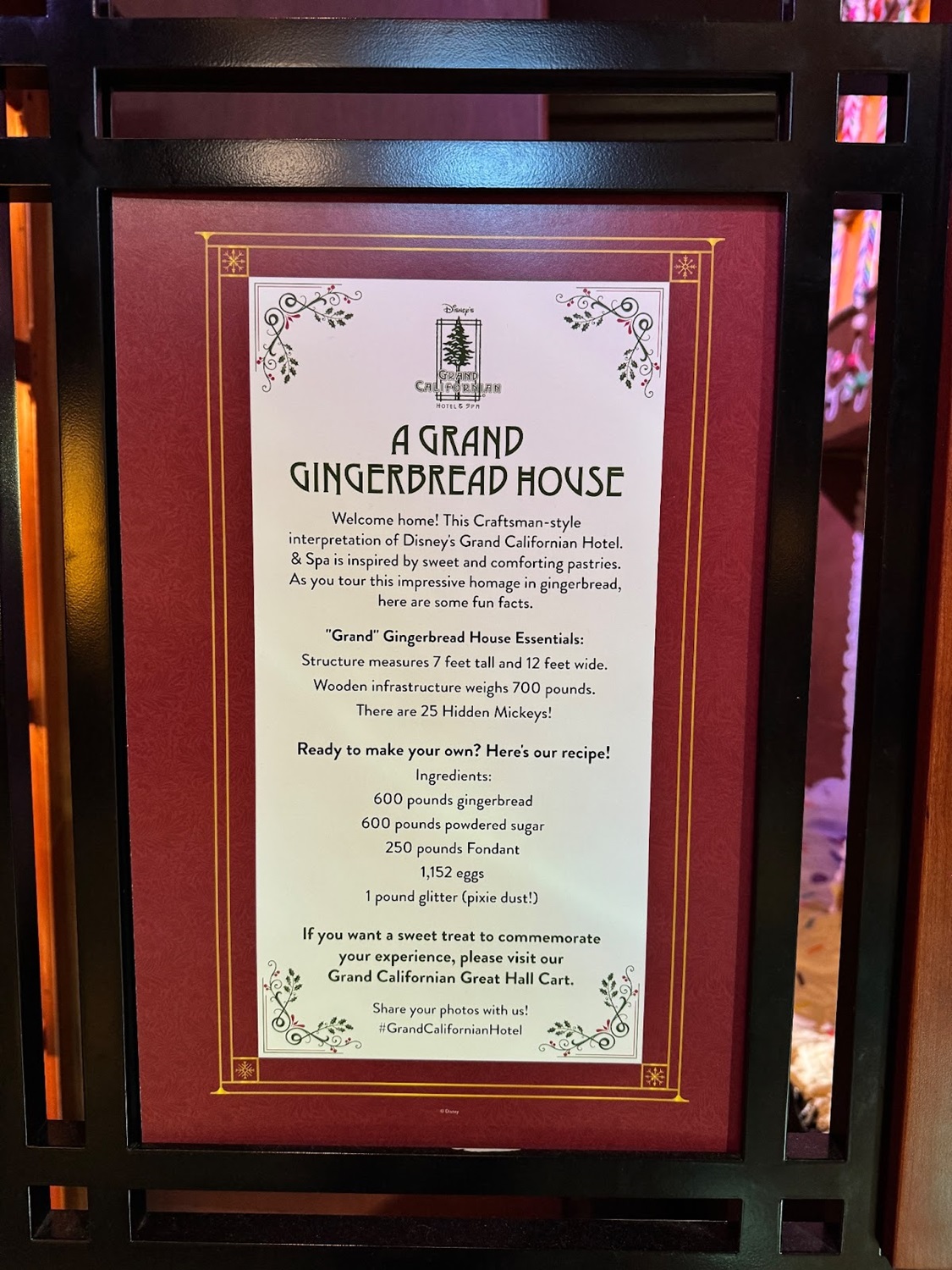 Standing 7 feet tall and 12 feet wide, the structure is created from more than 600 pounds of gingerbread, 600 pounds of powdered sugar, 250 pounds of fondant, one pound of pixie dust, and features 25 hidden Mickeys!