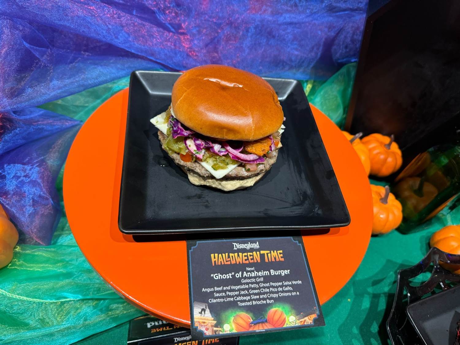 “Ghost" of Anaheim Burger: Angus beef and vegetable patty, ghost pepper salsa verde sauce, pepper jack, green chile pico de gallo, cilantro-lime cabbage slaw, and crispy onions on a toasted brioche bun (Galactic Grill)