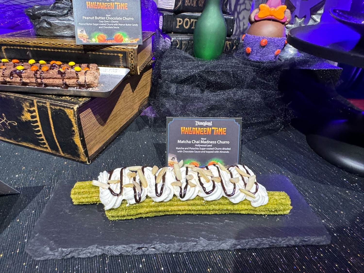 Matcha Chai Madness Churro: Matcha and pistachio sugar-coated churro drizzled with chocolate sauce and topped with almonds (Hollywood Land)