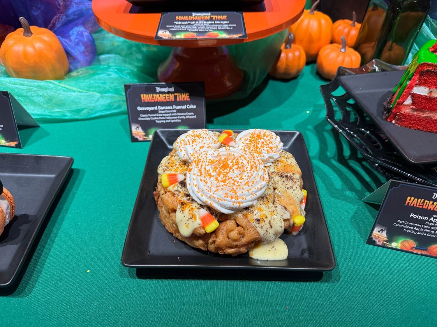 Graveyard Banana Funnel Cake: Classic funnel cake topped with banana cream, chocolate cookie dust, Halloween candy, whipped topping, and sprinkles (Stage Door Cafe)