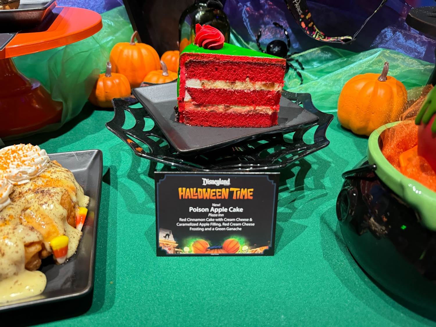 Poison Apple Cake: Red cinnamon cake with cream cheese & caramelized apple filling, red cream cheese frosting, and a green ganache (Plaza Inn through October 31st)
