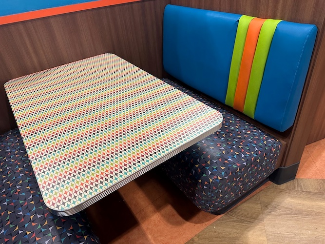 The new design aesthetic features bright colors, fun patterns, and new booth seating placing the theming outside of a specific decade, yet prominently “groovy."