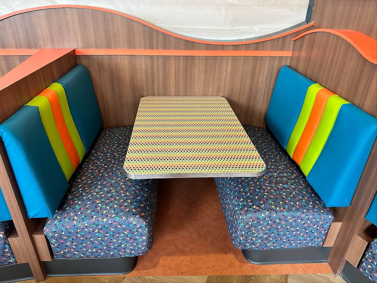 As walls come down, the new design aesthetic is also starting to appear, with bright colors, fun patterns, and new booth seating placing the theming outside of a specific decade, yet prominently “groovy".