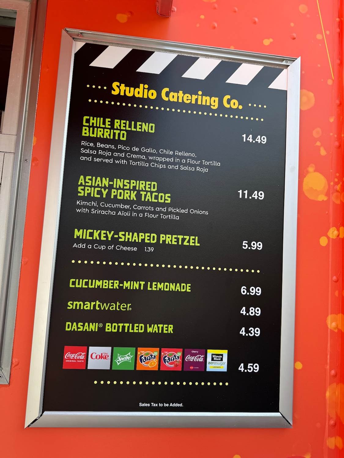 - The menu currently consists of a Chile Relleno Burrito, Asian-Inspired Spicy Pork Tacos and a Mickey Pretzel.
