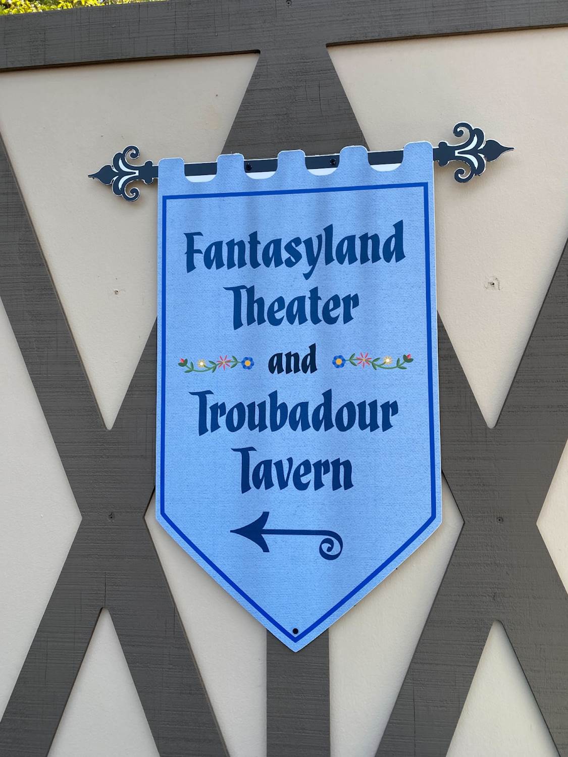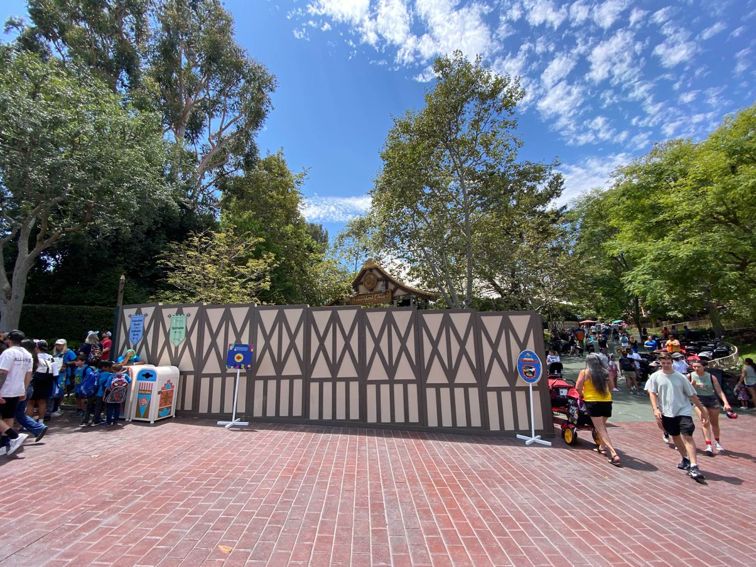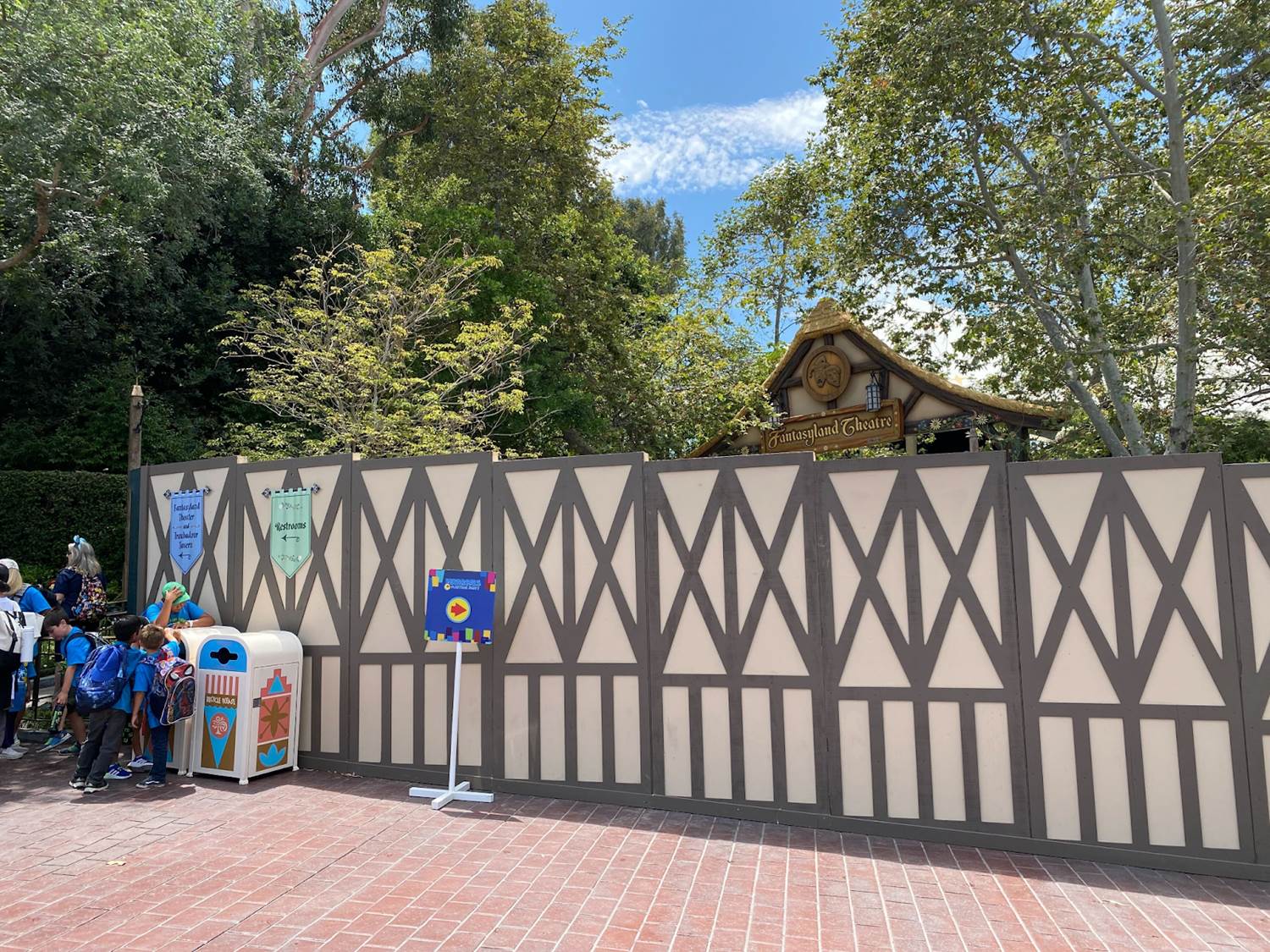 Construction walls are up along the entrance of the Fantasyland Theatre at Disneyland, with guests being directed off to the sides to access the restrooms and Troubadour Tavern.