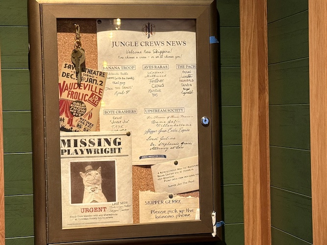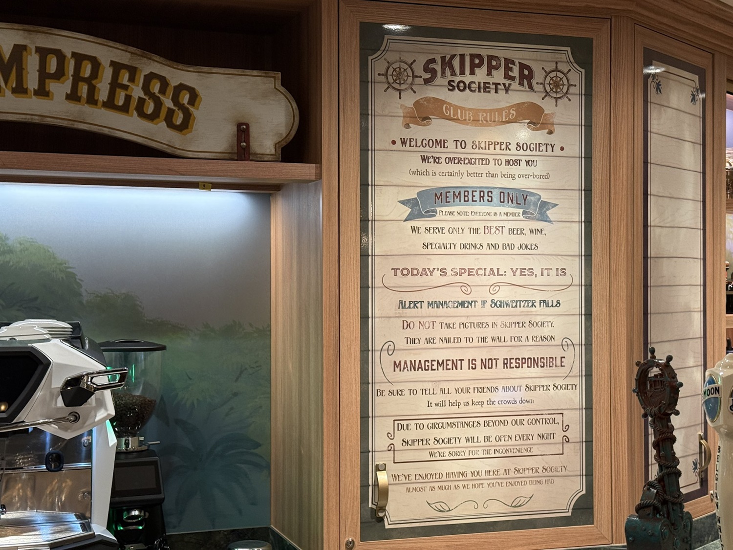 - The green and red tones depicted on the walls of Skipper Society are exact color matches to the Jungle Cruise attraction marquee at Disneyland.