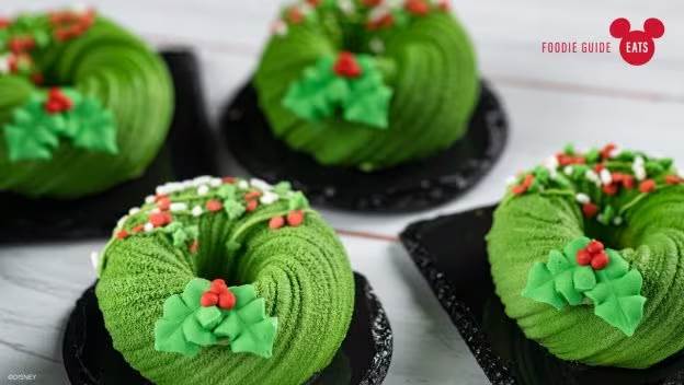 Mint Chocolate Mousse Wreath, Apple Caramel Crumb Cake, Chocolate-covered Toffee Brittle and Red Velvet Mini Bundt Cake with Cream Cheese Icing from Holiday Hearth Desserts at EPCOT Festival of the Holidays 2023