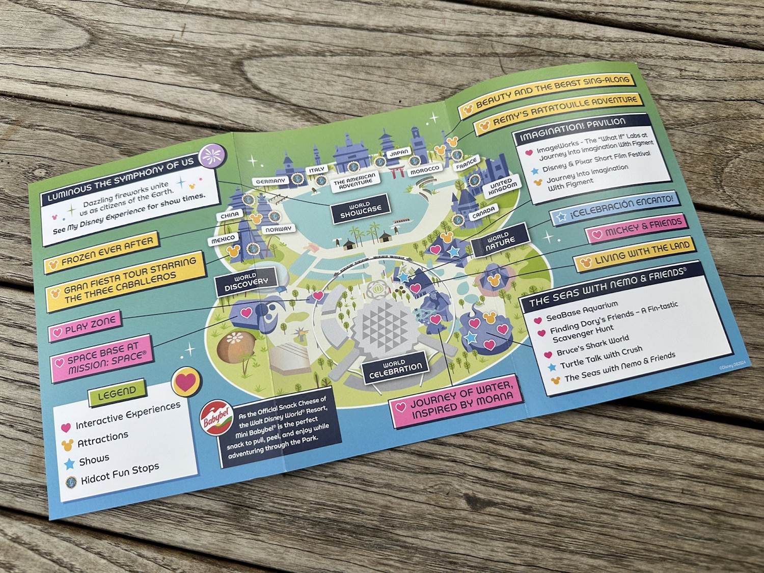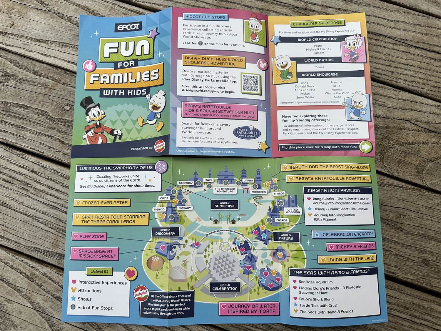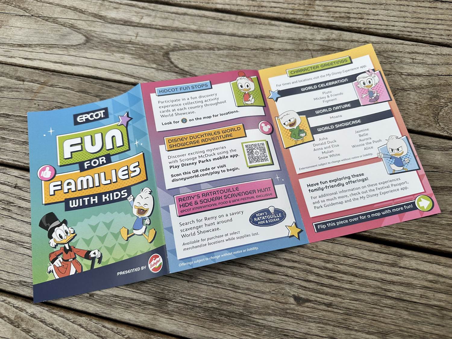 - The inner fold advertises such experiences as Kidcot Fun Stops, the DuckTales World Showcase Adventure, Remy’s Ratatouille Hide & Squeak Scavenger Hunt, and various character greetings.