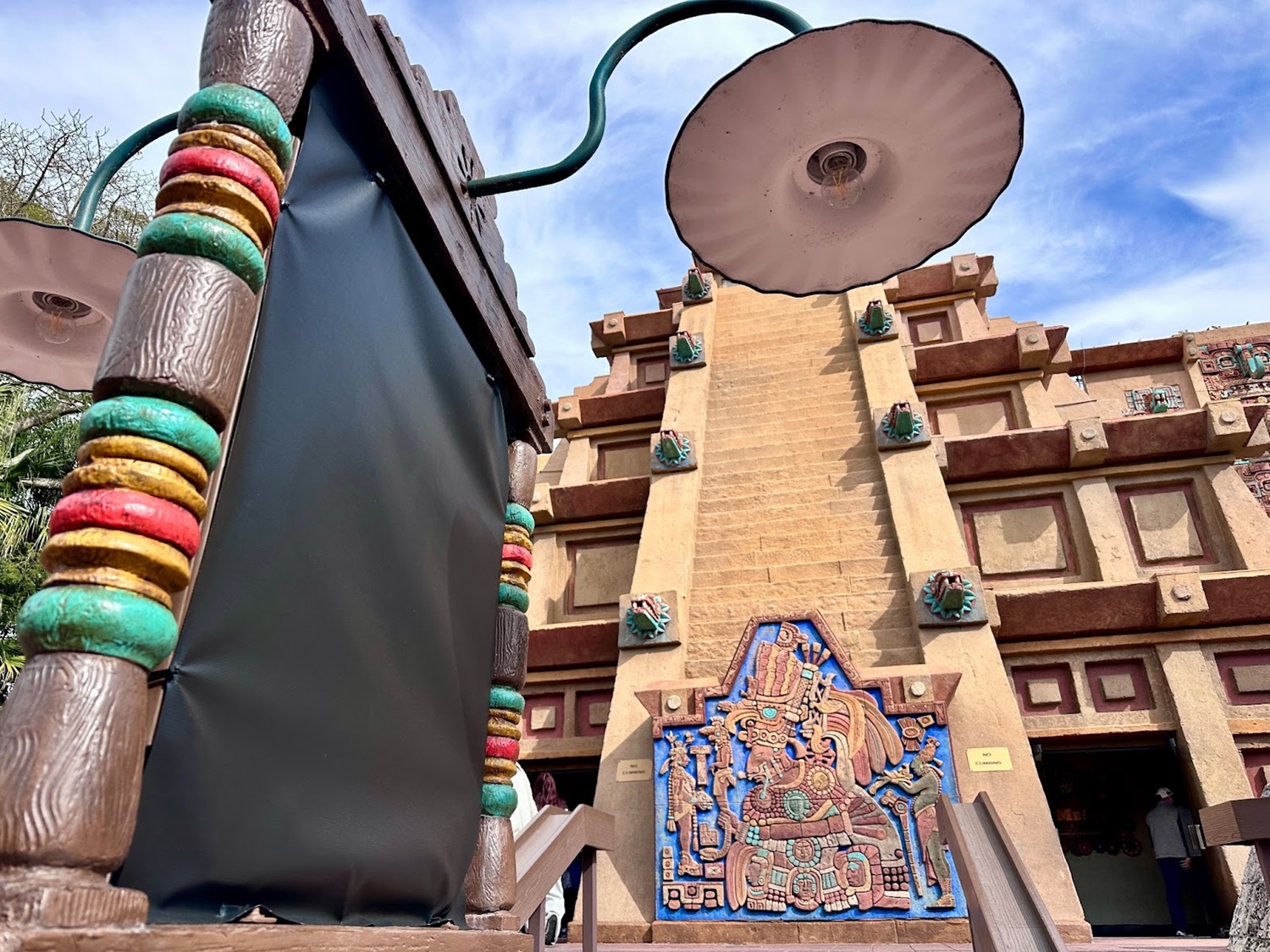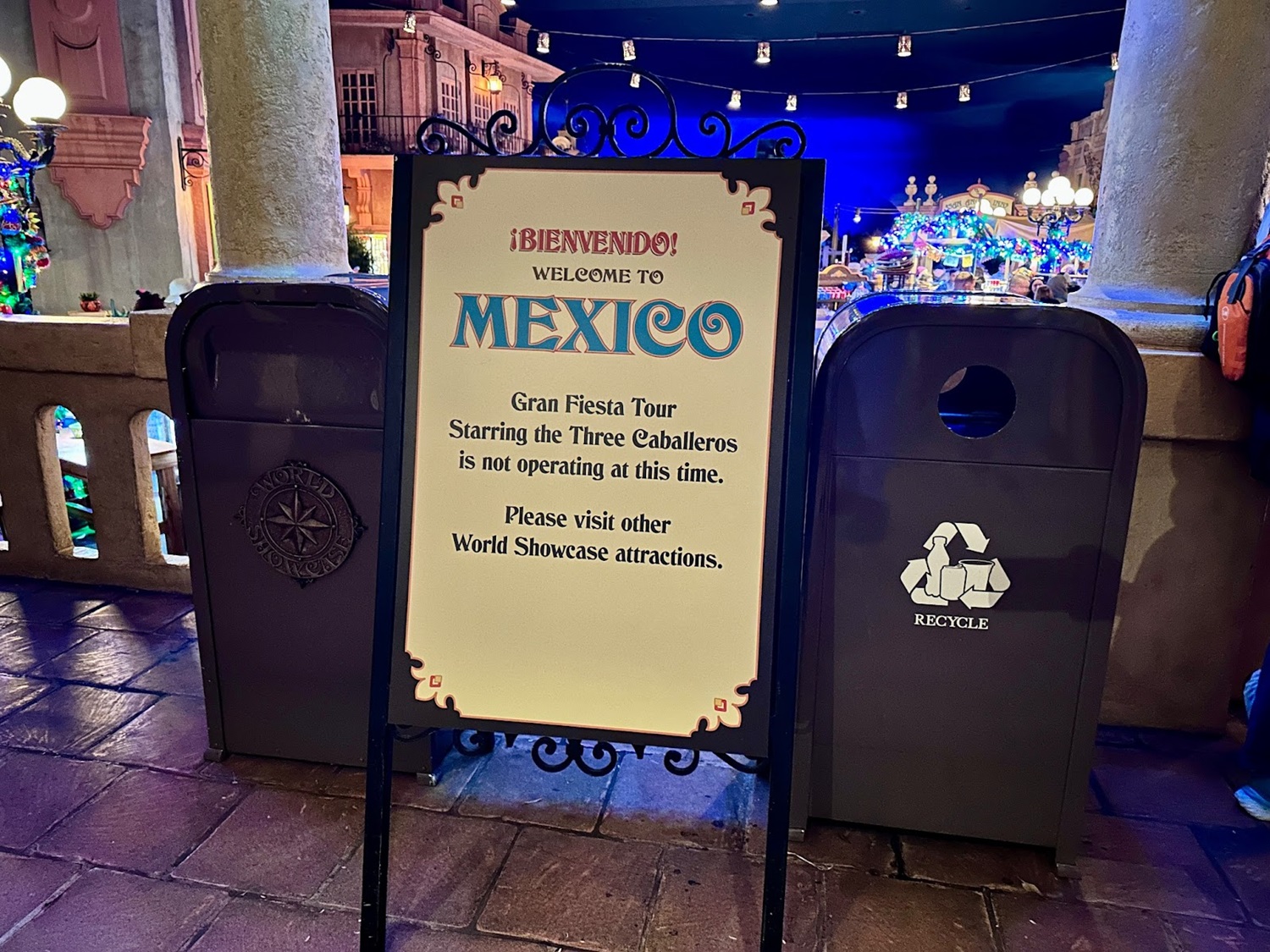 - As guests enter the Mexico pavilion, a sign notes that the attraction is closed, while the signage outside the pavilion is somewhat unceremoniously covered in a black tarp.