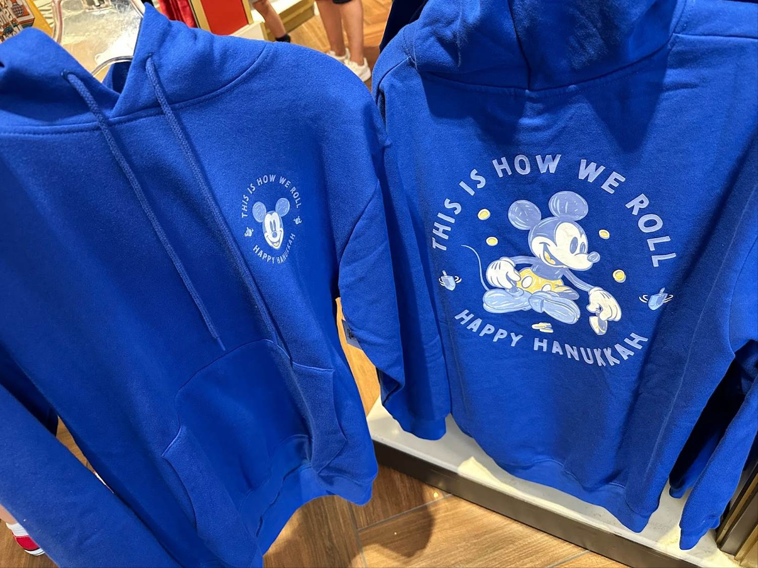 - First up, we have a new hoodie featuring Mickey Mouse spinning a dreidel surrounded by chocolate gelt. The adorably festive blue sweatshirt is adorned with the words “This is how we roll." You can grab this cozy sweatshirt for $54.99.