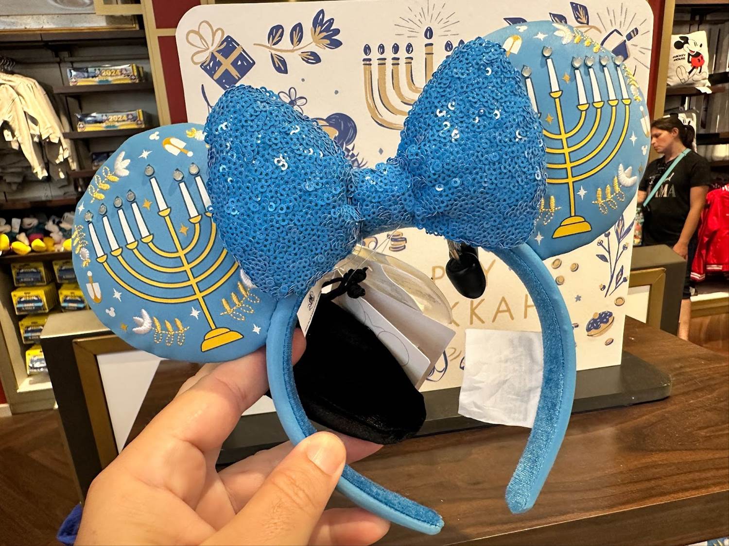 - The new Minnie ears feature menorahs and dreidels along with a sequined blue bow. In celebration of the Festival of Lights, these ears also feature a light up effect that illuminates the candles on the menorahs. The accessory retails for $34.99.