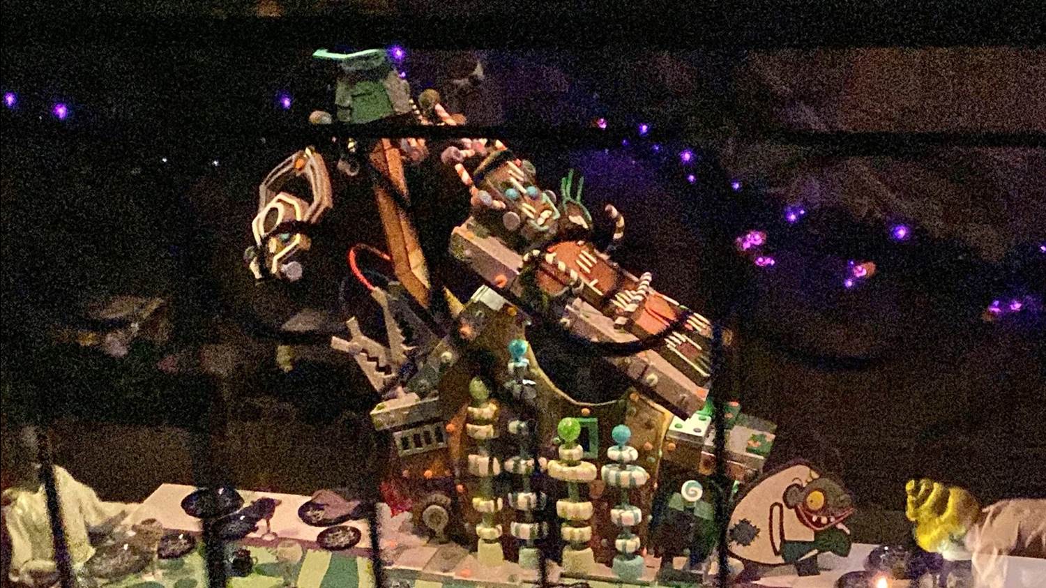 Aboard the attraction, a brand-new gingerbread house centerpiece has debuted in the ballroom scene, as is tradition. This one is a remarkable step up from years past, with lighting effects as well as animation as a Frankenstein’s Monster-esque creature comes to life.