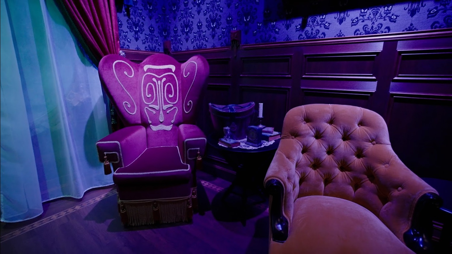 Fans will immediately recognize things from the Haunted Mansion attractions around the globe, including the iconic purple wallpaper framed by wooden finishes to a mantel clock atop an inviting fireplace to a distinctive purple armchair tucked in the corner.