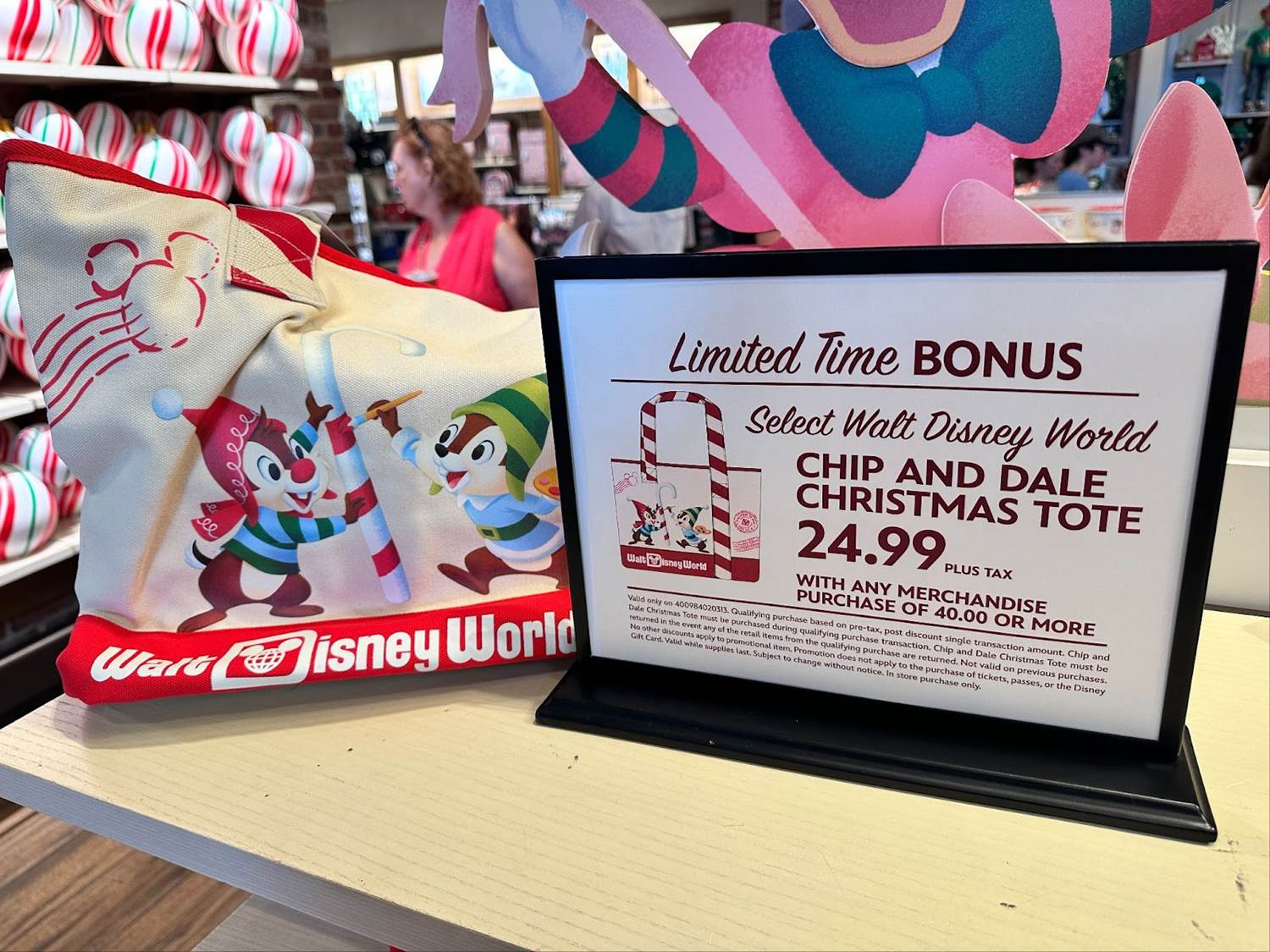 - In addition to these exciting holiday items, World of Disney is offering an exclusive Chip and Dale Christmas tote. With any purchase of $40 or more, guests can pick up the holiday accessory for $24.99. The tote is unavailable outside of this deal.