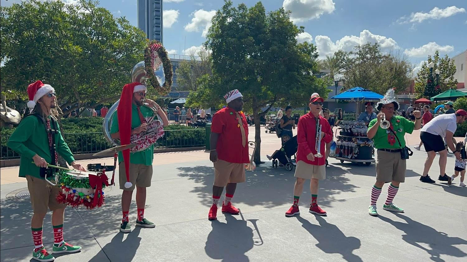 If you want to just listen and enjoy some brass band variations on classic holiday songs, then you’ll definitely want to take in a performance from The Holiday Spirits Band. Dressed head to toe in over-the-top tinsel, the band performs some classic holiday tunes – even getting some assistance from Goofy’s son Max. While the band was on the march, we caught them in front of Echo Lake and the Hyperion Theater.