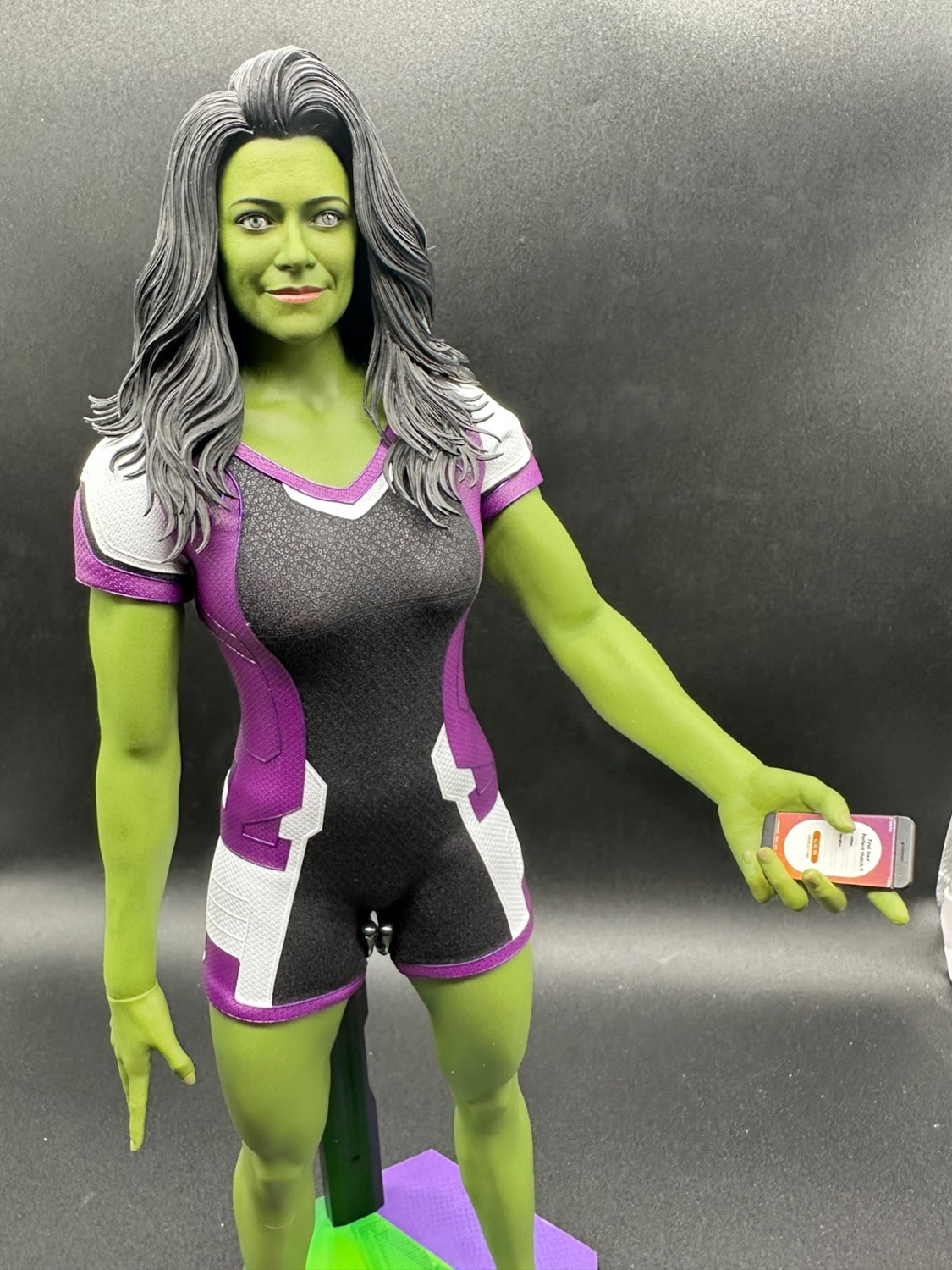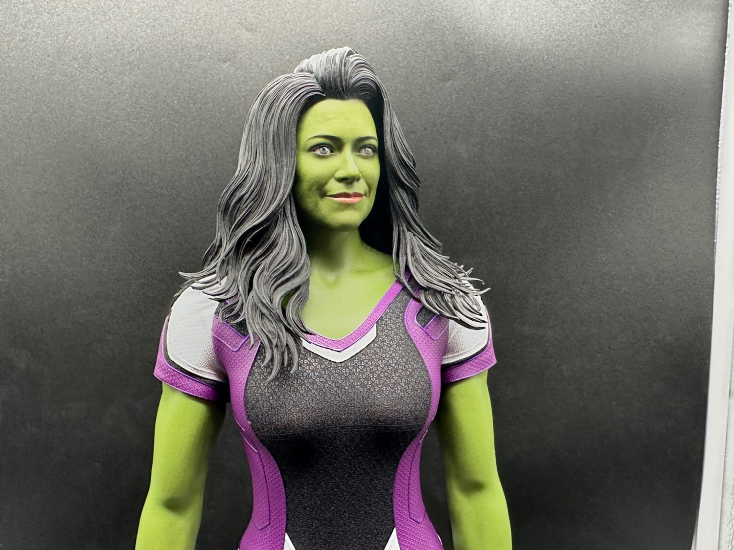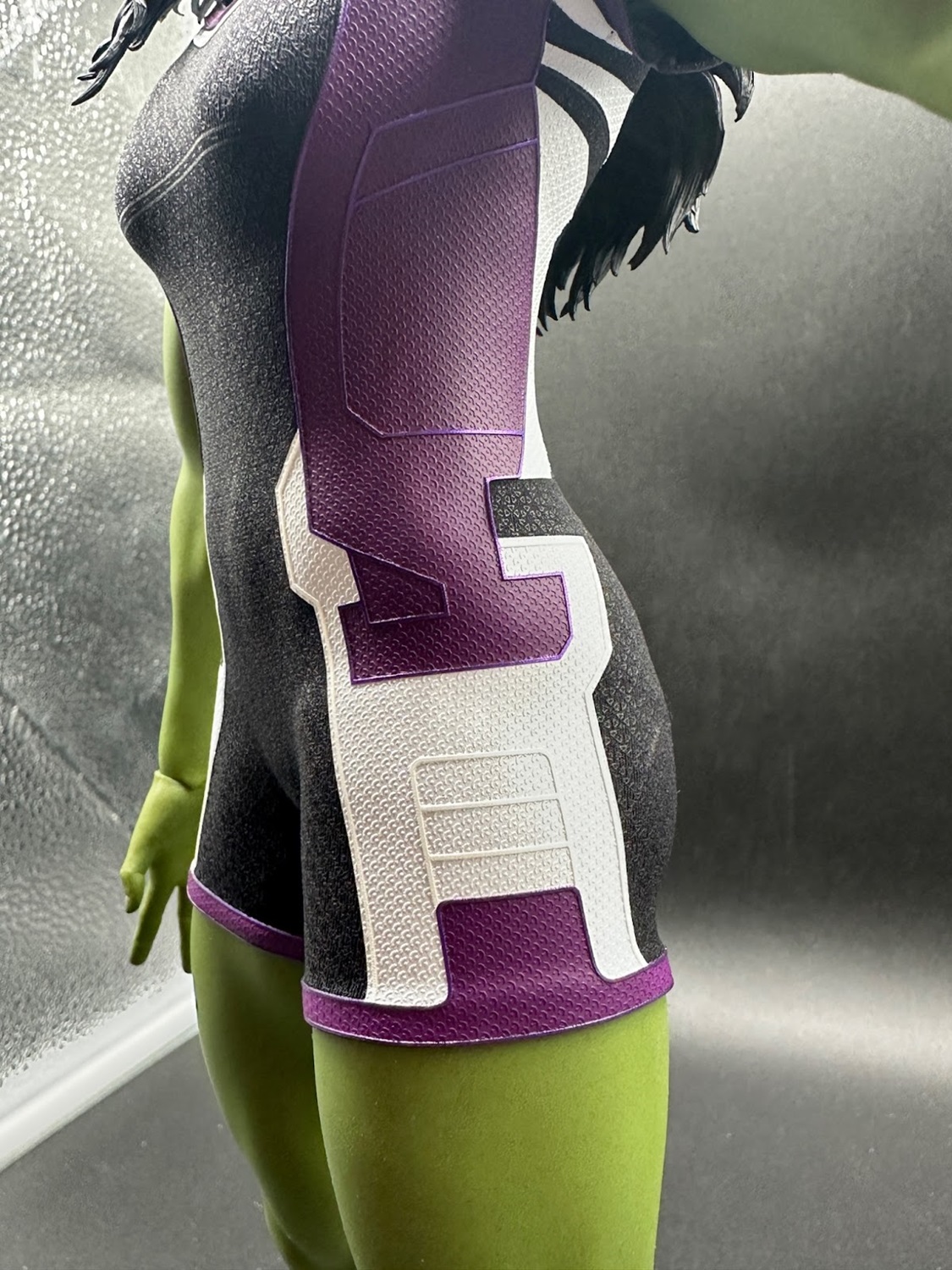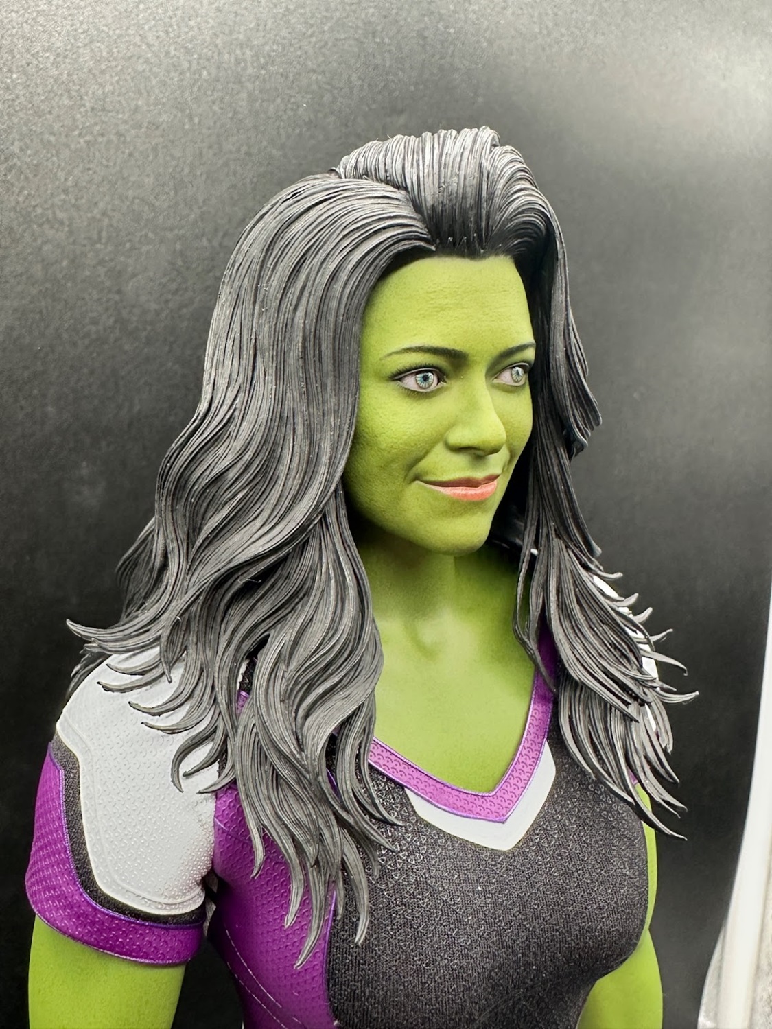 Her face looks great and, given the figure is a very real object, arguably this figure is an even more “realistic" version than the onscreen digital She-Hulk would sometimes look under close inspection. It’s very clearly Tatiana Maslany’s face and features, with the green skin tone given subtle details like small lines that sell it as a person’s Gamma-green skin. Some may wish they’d gone for a “tougher" expression, but the smiling portrait reflects the show’s lighter tone and Jennifer Walters’ frequent attitude when She-Hulk-ing.