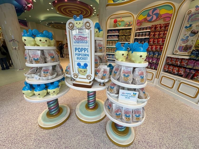 Walking into Disney Wonderful World of Sweets, guests will be welcomed by the shop’s new original character Poppi. Inspired by popcorn, guests can pick up a popcorn bucket themed to the adorable addition.