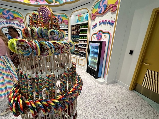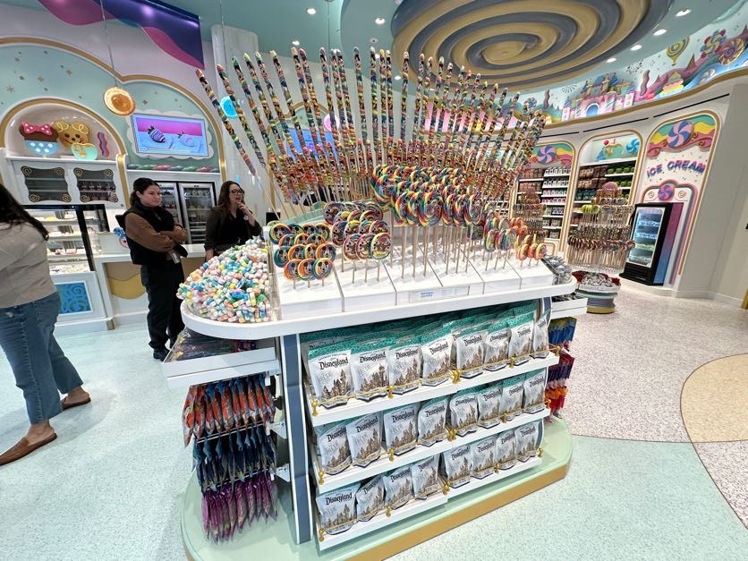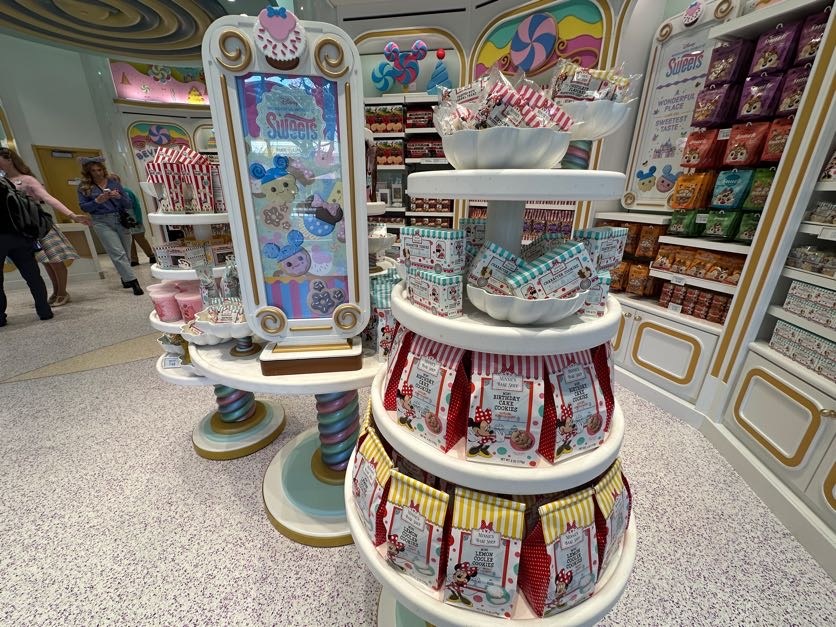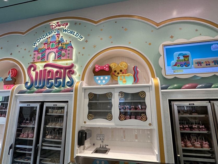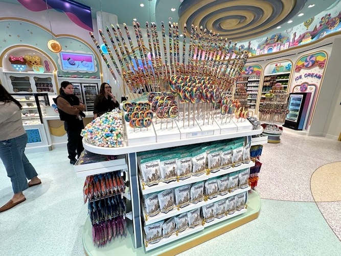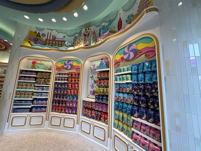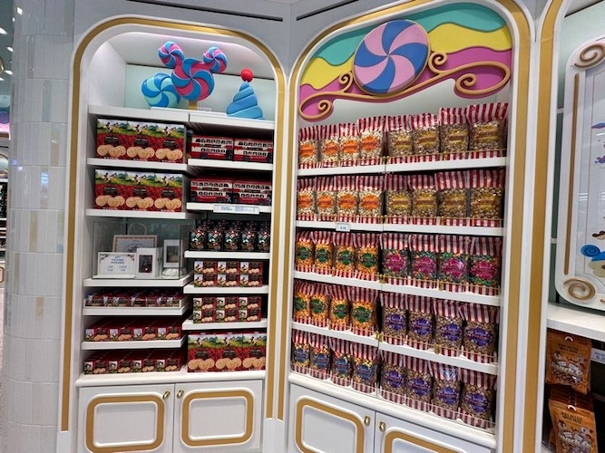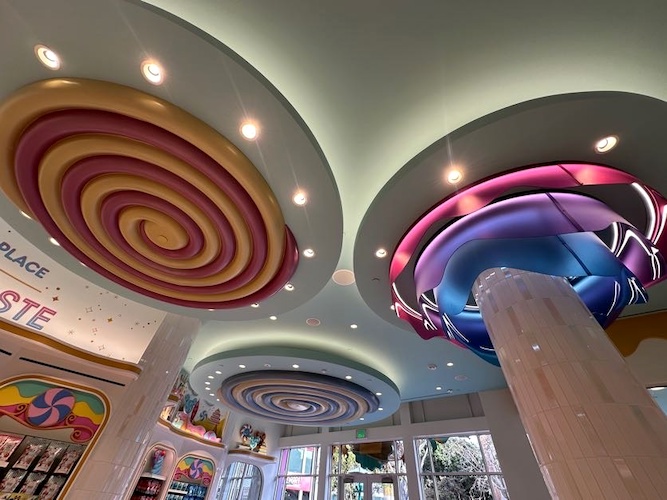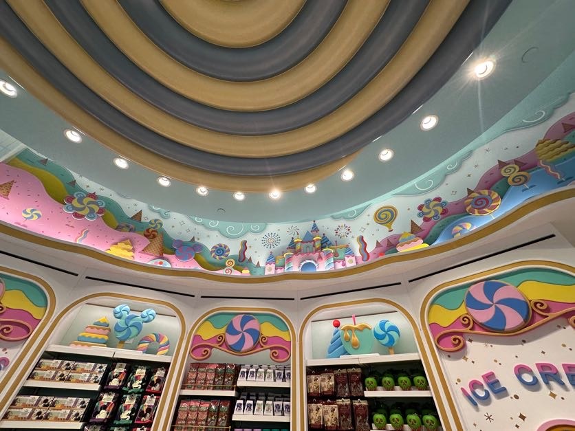 Throughout the store, guests will find shelves loaded in treats surrounded by dessert inspired designs. As you look up, candy-crafted versions of Disney Parks icons can be seen decorating the walls. Even the ceiling is topped with delicious layers of frosting.