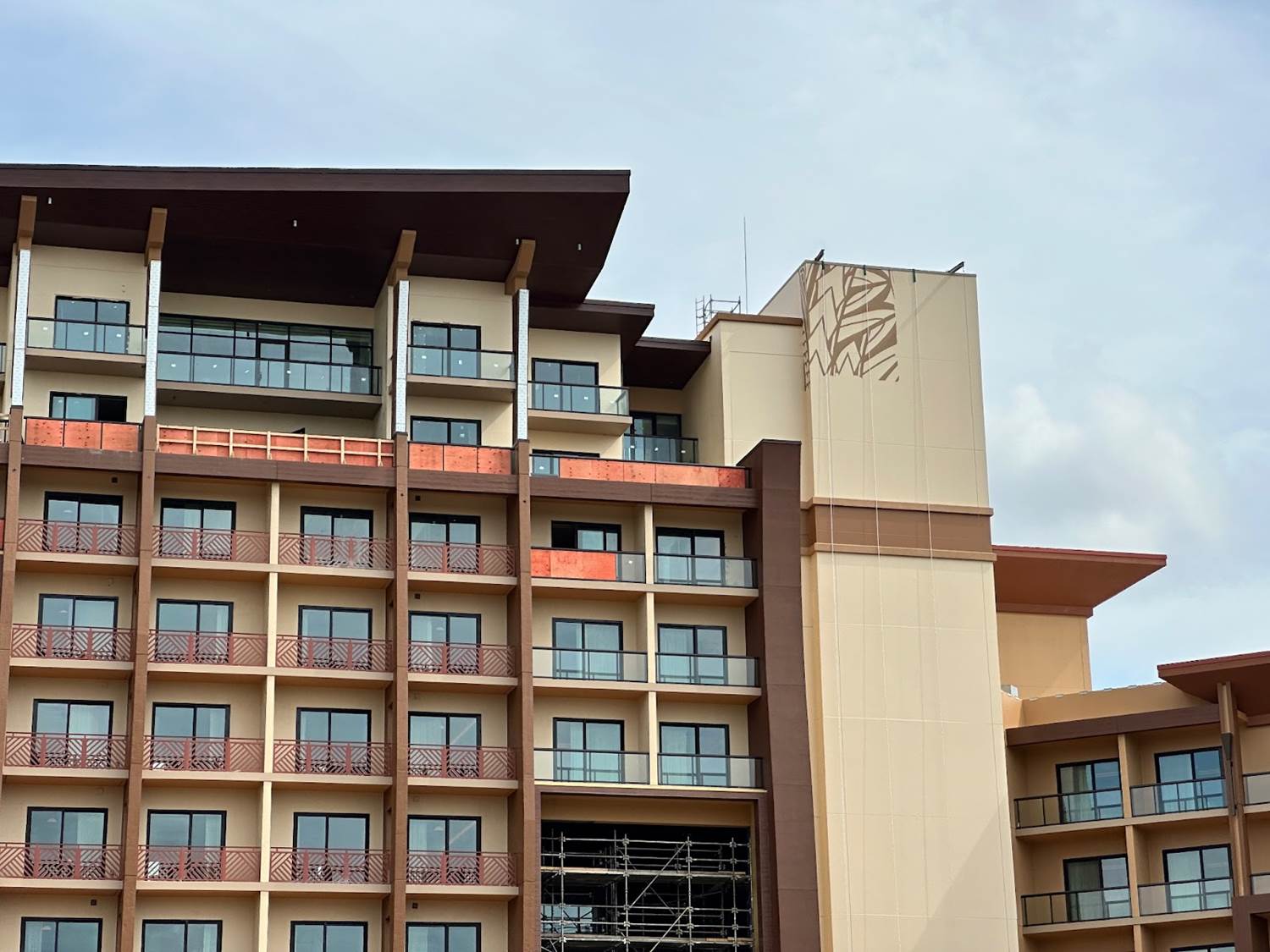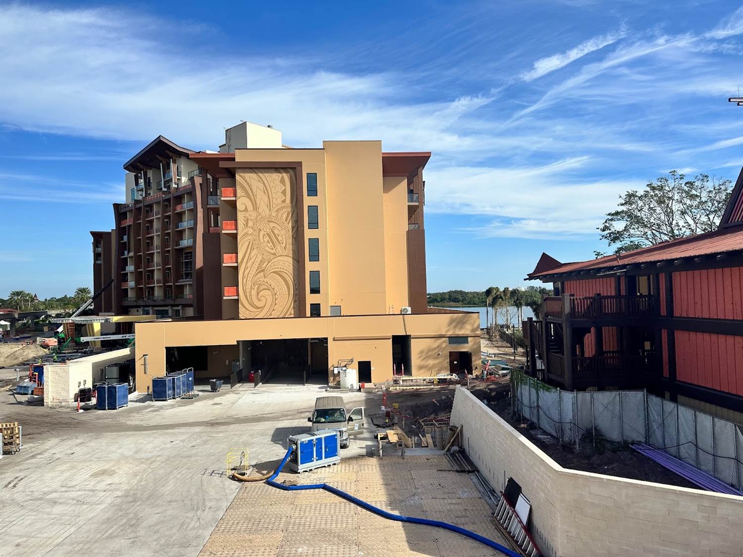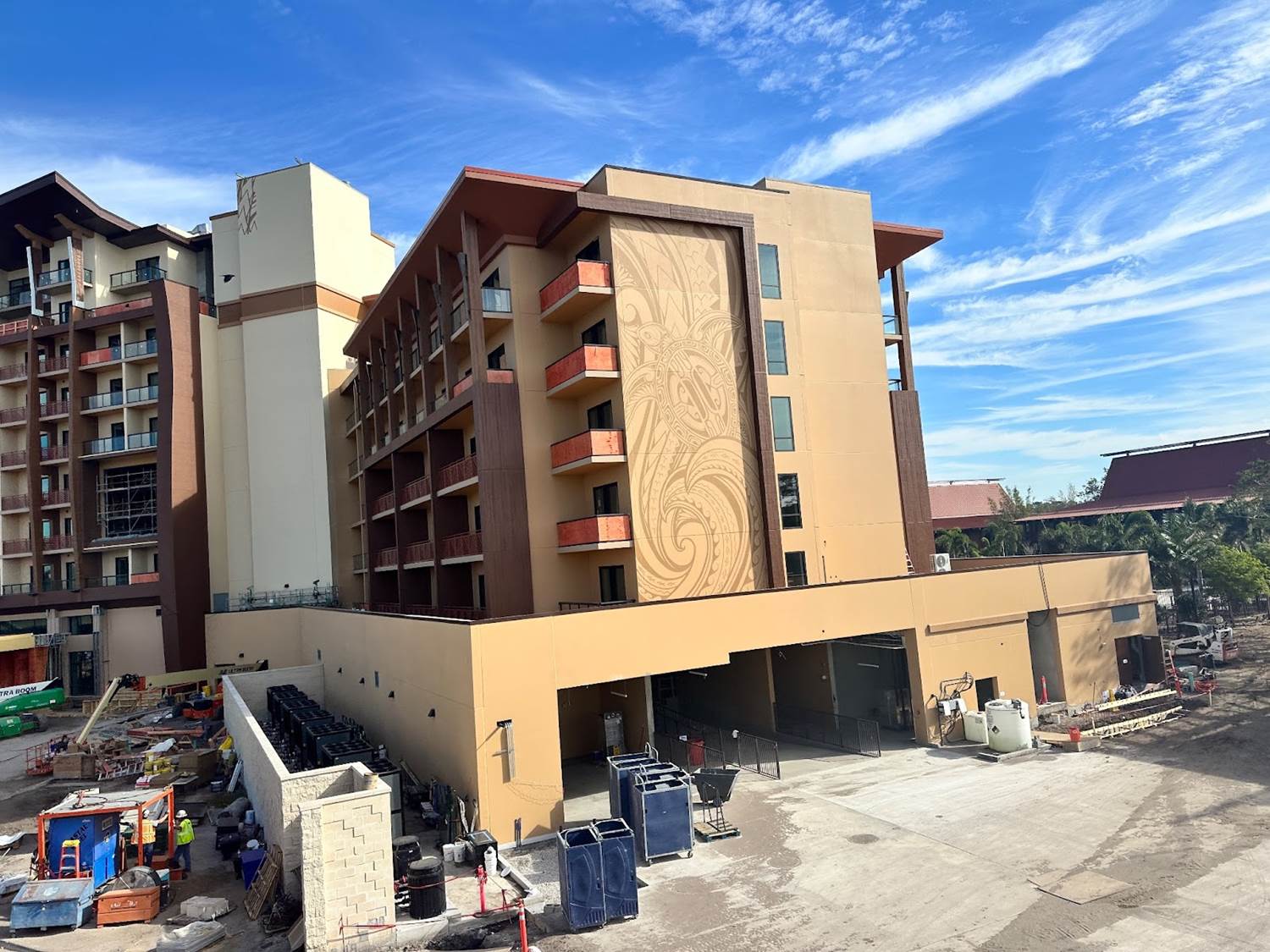 The latest construction progress on the new Island Tower at Disney’s Polynesian Village Resort sees one mural completed with work on another beginning.