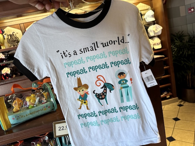 A fun t-shirt reminds us of the repetitive nature of the signature Sherman Brothers tune, and features some art in the same style of figures on the ride.