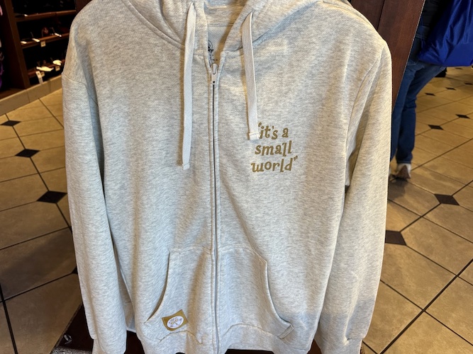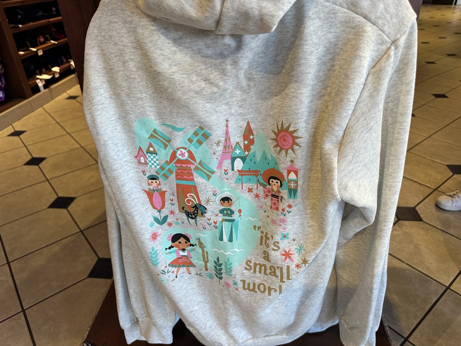 And perfect for these colder winter days, a hoodie that features the attraction title on the front and plenty of art and insignias of the different worldly locations experienced aboard the classic, “it’s a small world" attraction.