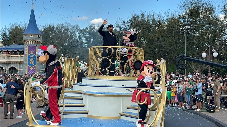 - This year, Philadelphia Eagles quarterback and Super Bowl MVP Hurts joined in on a pre-parade celebration, cheering alongside fans in the hub before heading down Main Street, U.S.A.
