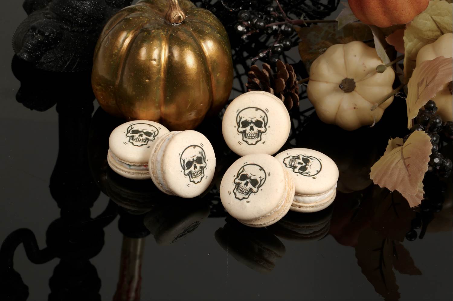 - Skull Macarons: Macarons with vanilla confetti buttercream and a printed black skull haunt the bakery in time for Halfway to Halloween!