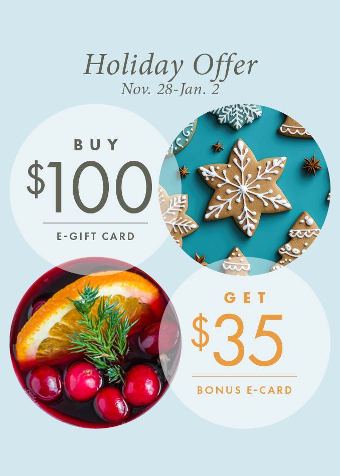 - For every $100 spent on gift card(s) in a single transaction, Patina will issue the purchaser an additional $35 bonus card. Gift card(s) must be purchased between 11/28/2023 - 1/2/2024 to be eligible to receive the promotional $35 bonus card(s).