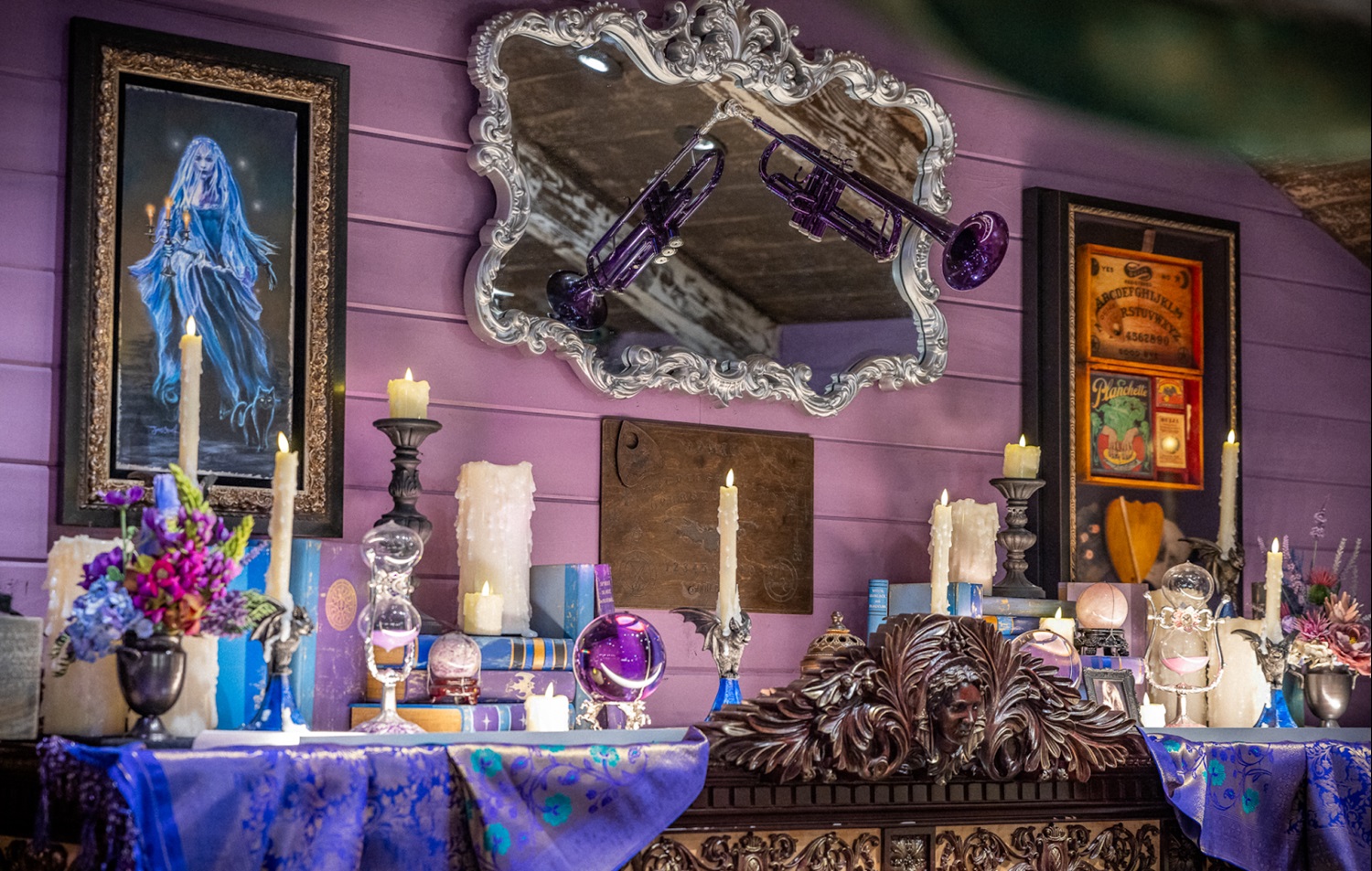 - As you can see from these pictures, the store is filled to the brim with her furniture, including a crystal ball, couch, and the original parlor chandelier that Leota used for séances in the mansion.