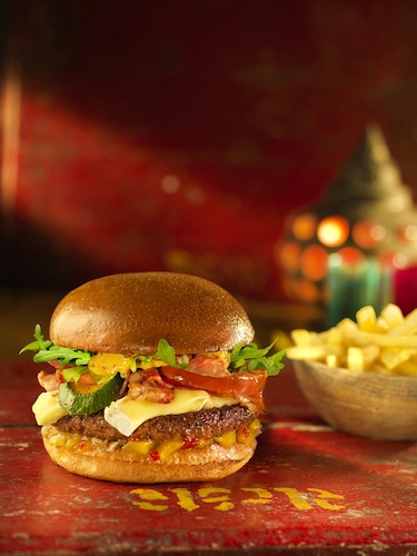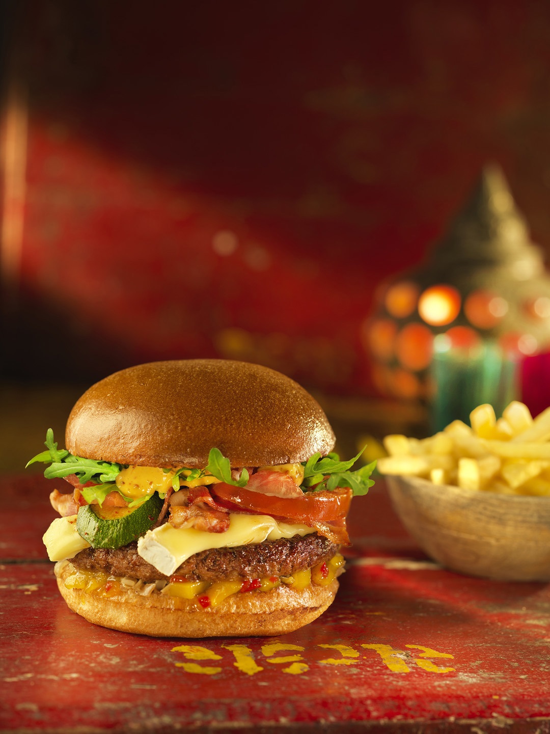 - The burger comes with a bun, beef steak, camembert cheese, spinach and rocket salad mix, pan-fried courgette and tomato, brown sugar grilled bacon, grilled shallot, Orléans mustard, espelette pepper sauce, mango chutney, and is served with fries.