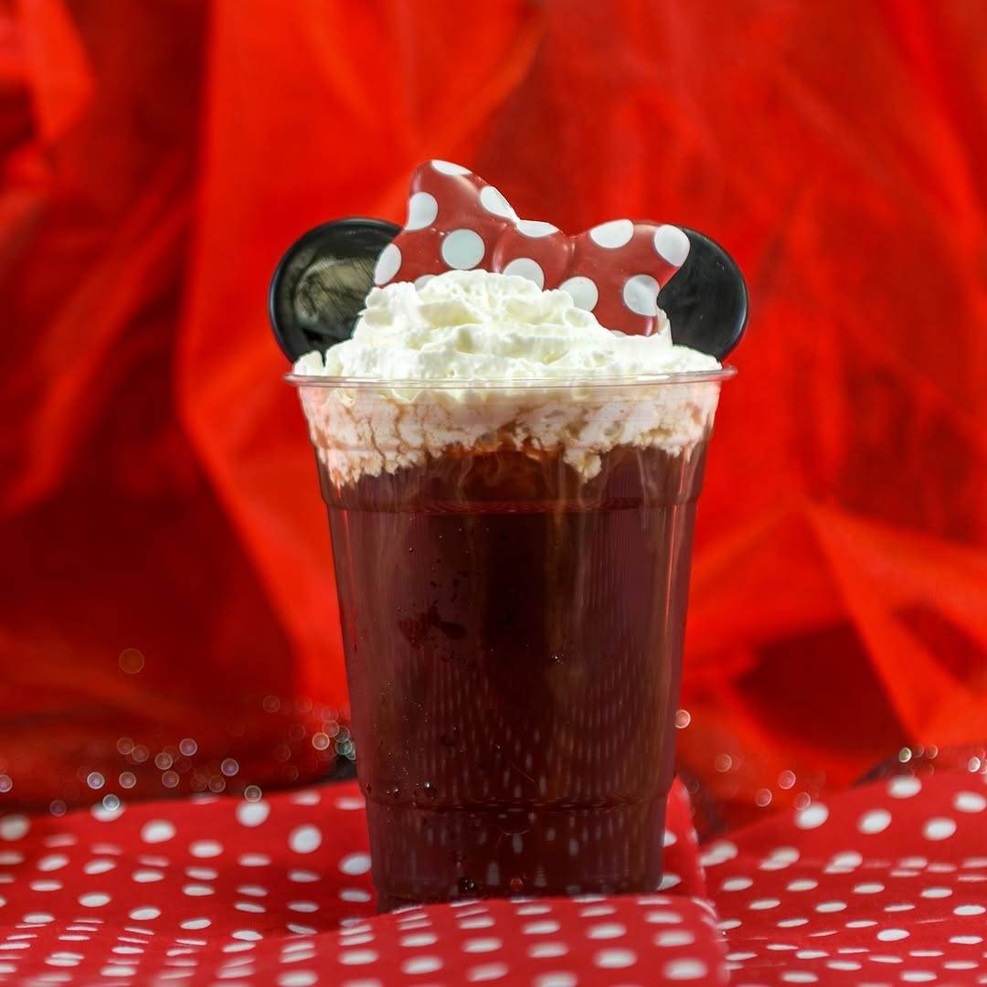 - Minnie’s Celebration Cold Brew: Joffrey's Coffee French Roast Cold Brew with vanilla syrup topped with whipped topping, two chocolate medallions, and a chocolate bow